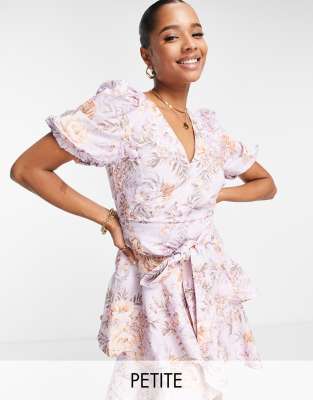 Ever New Petite puff sleeve tiered mini dress in lilac floral-Purple