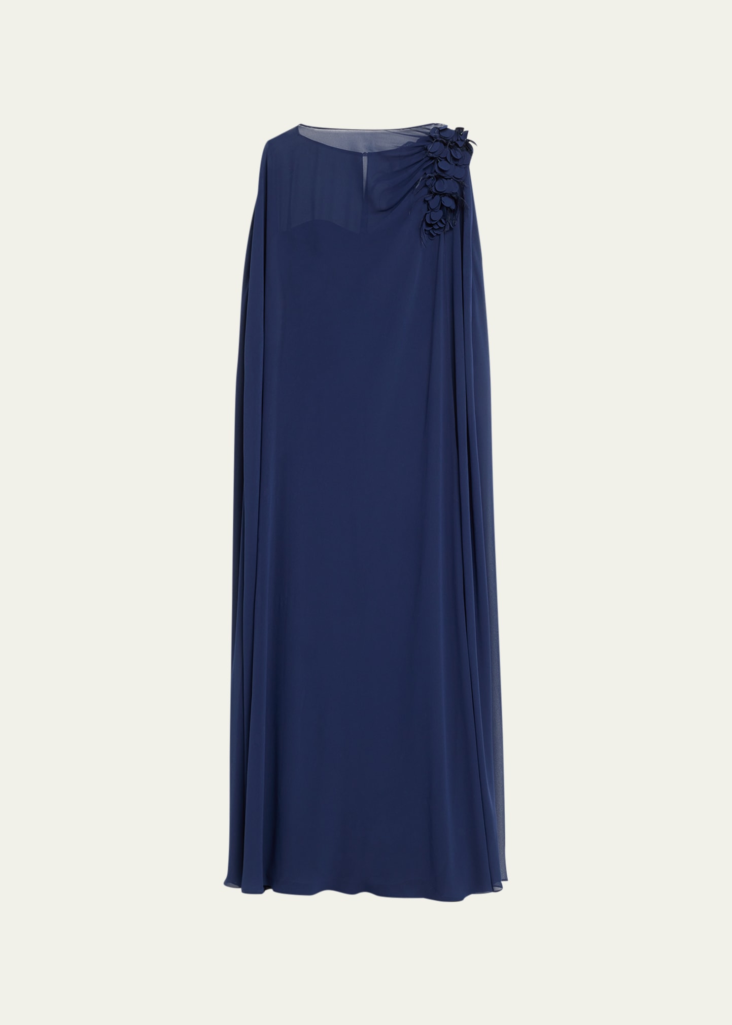 Badgley Mischka Collection gown with a sheer cape overlay and ostrich feather-embellished 3D flowers Bateau neckline; sweetheart illusion Sleeveless/strapless Floor-sweeping overlay Full-length, A-line silhouette Invisible back zipper Polyester/spandex/feather Lining: Polyester Dry clean Imported