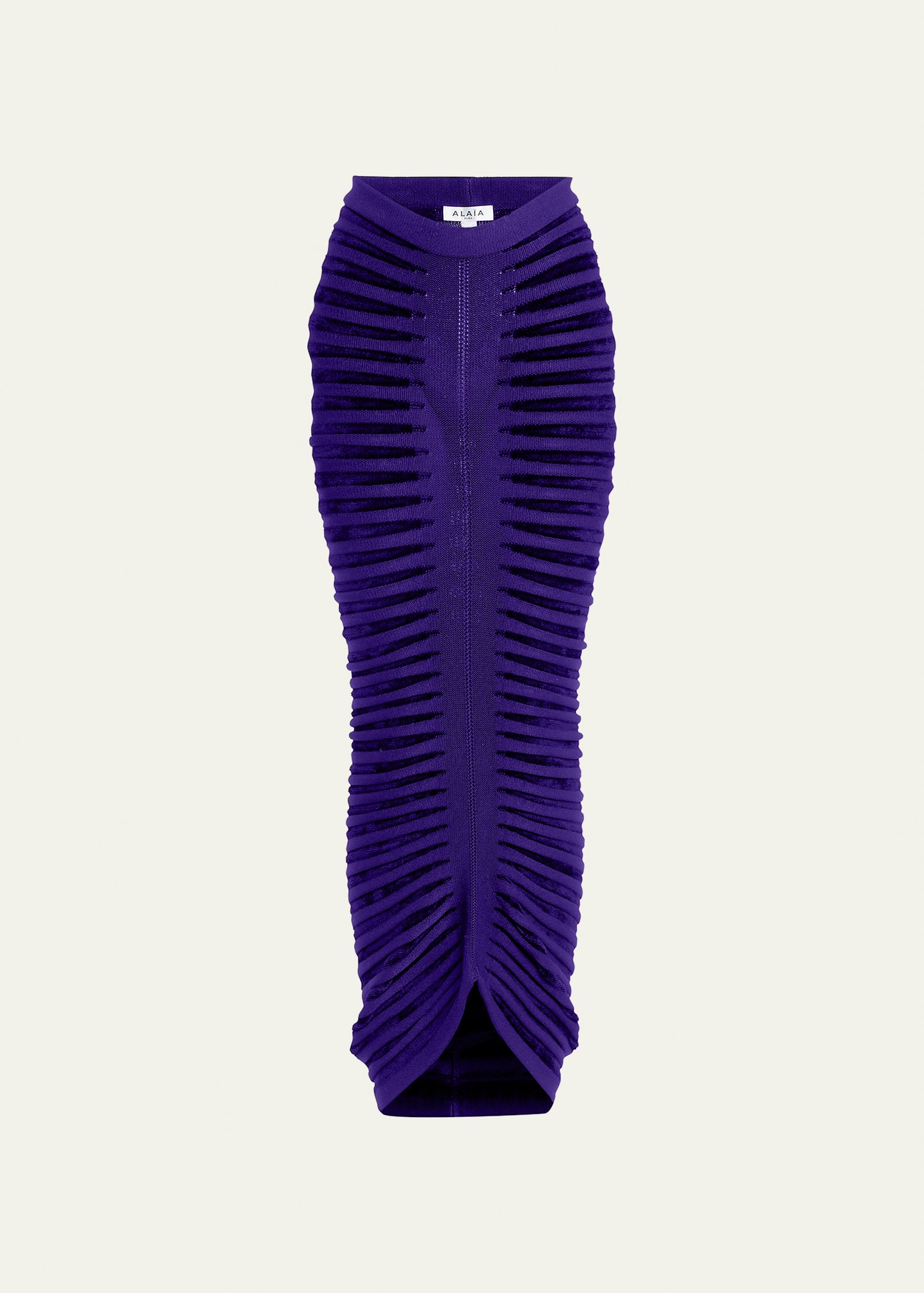 ALAIA fitted long skirt with ribbed styling throughout High rise; v-shape Full length Pencil style Viscose/polyamide/viscose Made in Italy