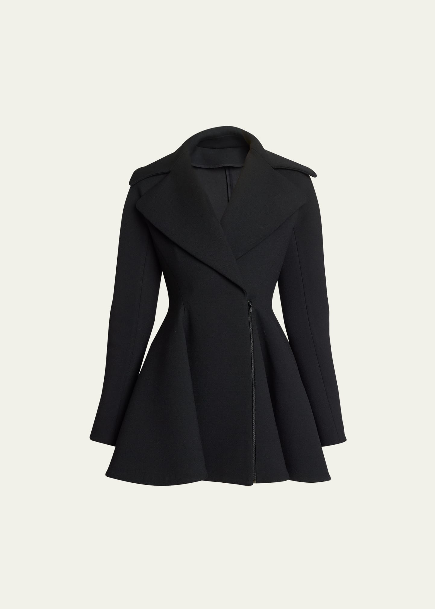ALAIA double-breasted wool princess coat features a flared peplum waist Notched collar Zipper front Long sleeves Side zip pockets Mid-length Relaxed fit Polyester/virgin wool/elastane Lining: Viscose Made in France