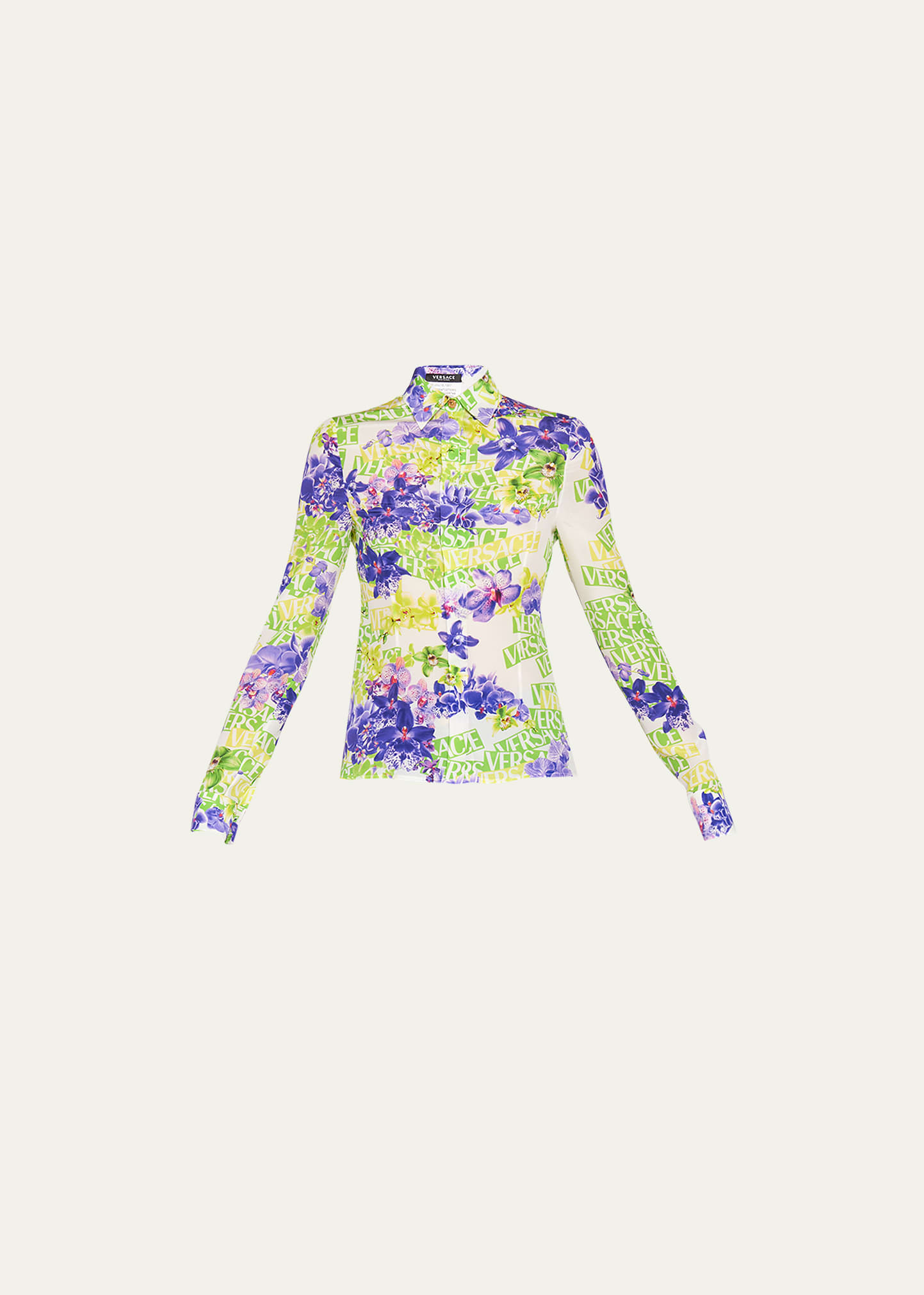Versace crepe de chine blouse in floral and logo print Point collar; concealed button placket Long sleeves; button cuffs Semi-fitted Silk Made in Italy