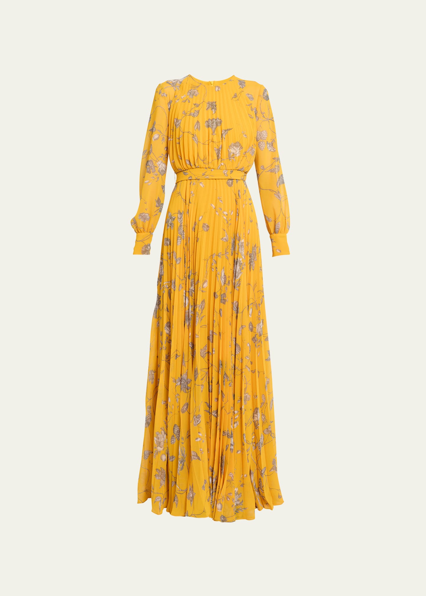 Erdem pleated gown in floral print Jewel neckline Long sleeves; button cuffs A-line silhouette Full length Back zip Polyester Acetate/silk lining Dry clean, professional cleaning recommended Made in Poland