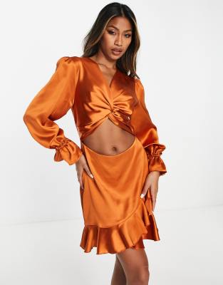 Flounce London satin balloon sleeve mini dress with cut out and ruffle detail in burnt orange