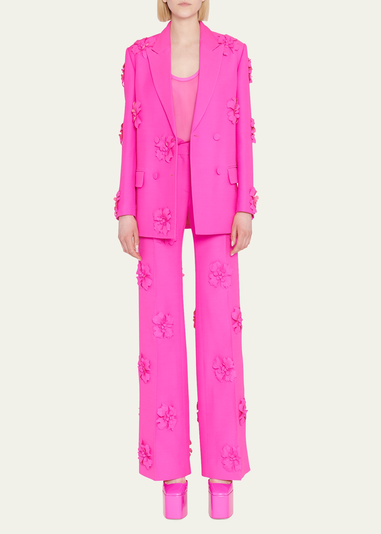 Valentino crepe trousers featuring allover flower applique embellishments Mid-rise; sits high on the hip Flat front Slip pockets at sides Wide legs Full length Hook/zip fly Virgin wool/silk Made in Italy