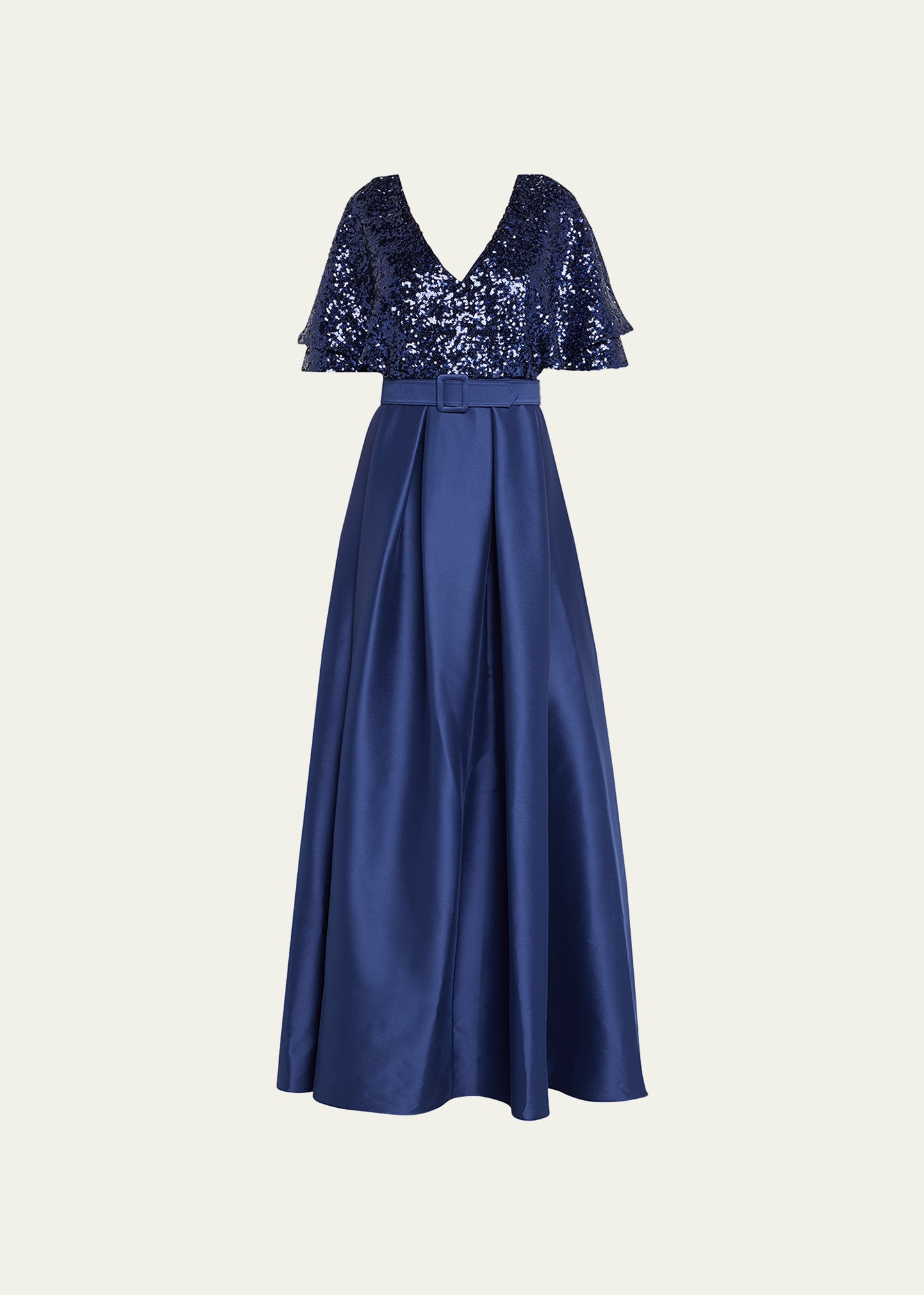 Badgley Mischka Collection pleated gown features a sequin bodice and belted waist V neckline Short flutter sleeves Side seam pockets Full length A-line silhouette Invisible back zipper Polyester/spandex Lining: Polyester Spot clean Imported