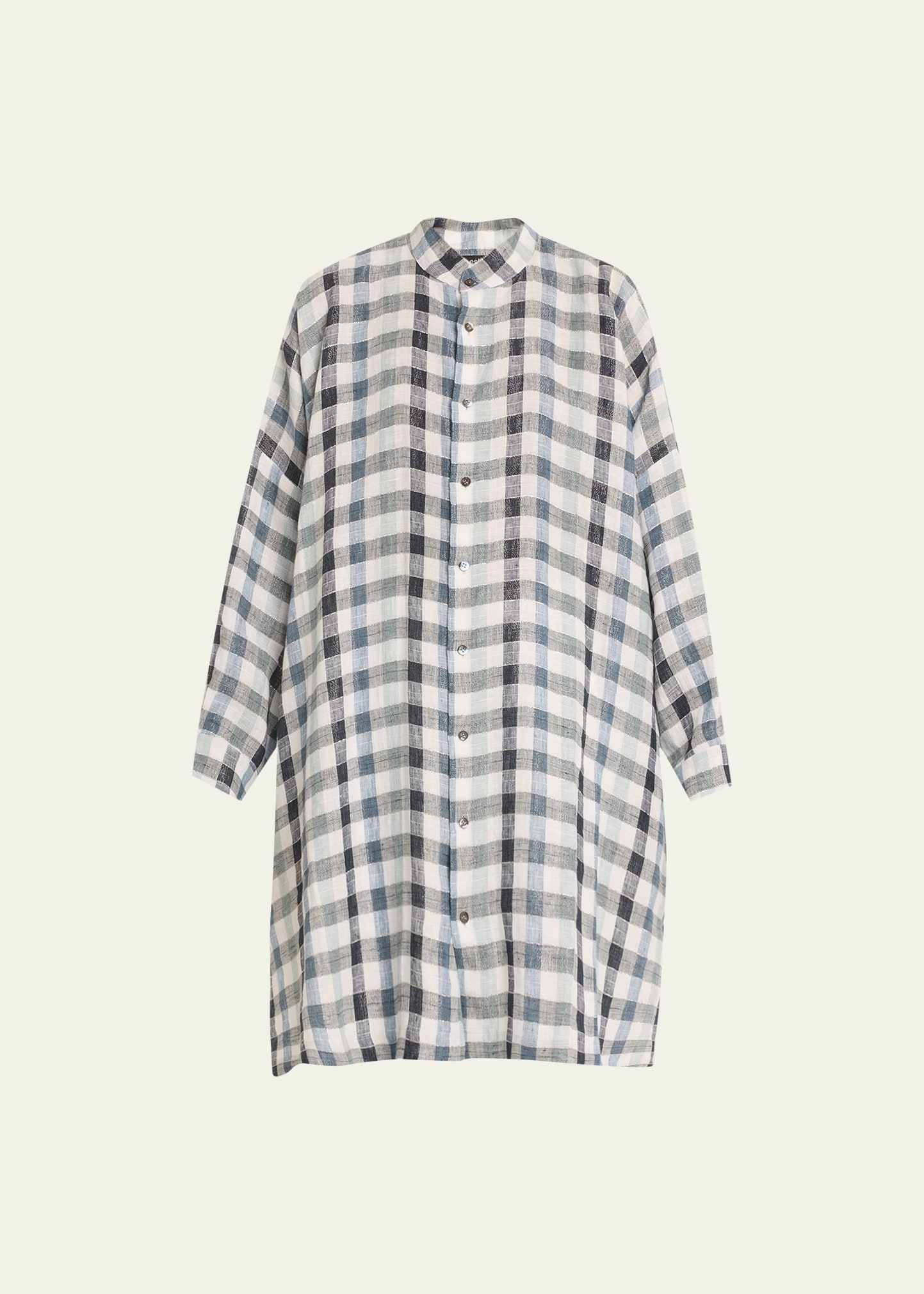 Eskandar gingham shirt with side slits Stand collar; button front Long sleeves; button cuffs Wide silhouette Very long length Linen/viscose/polyester Made in Poland