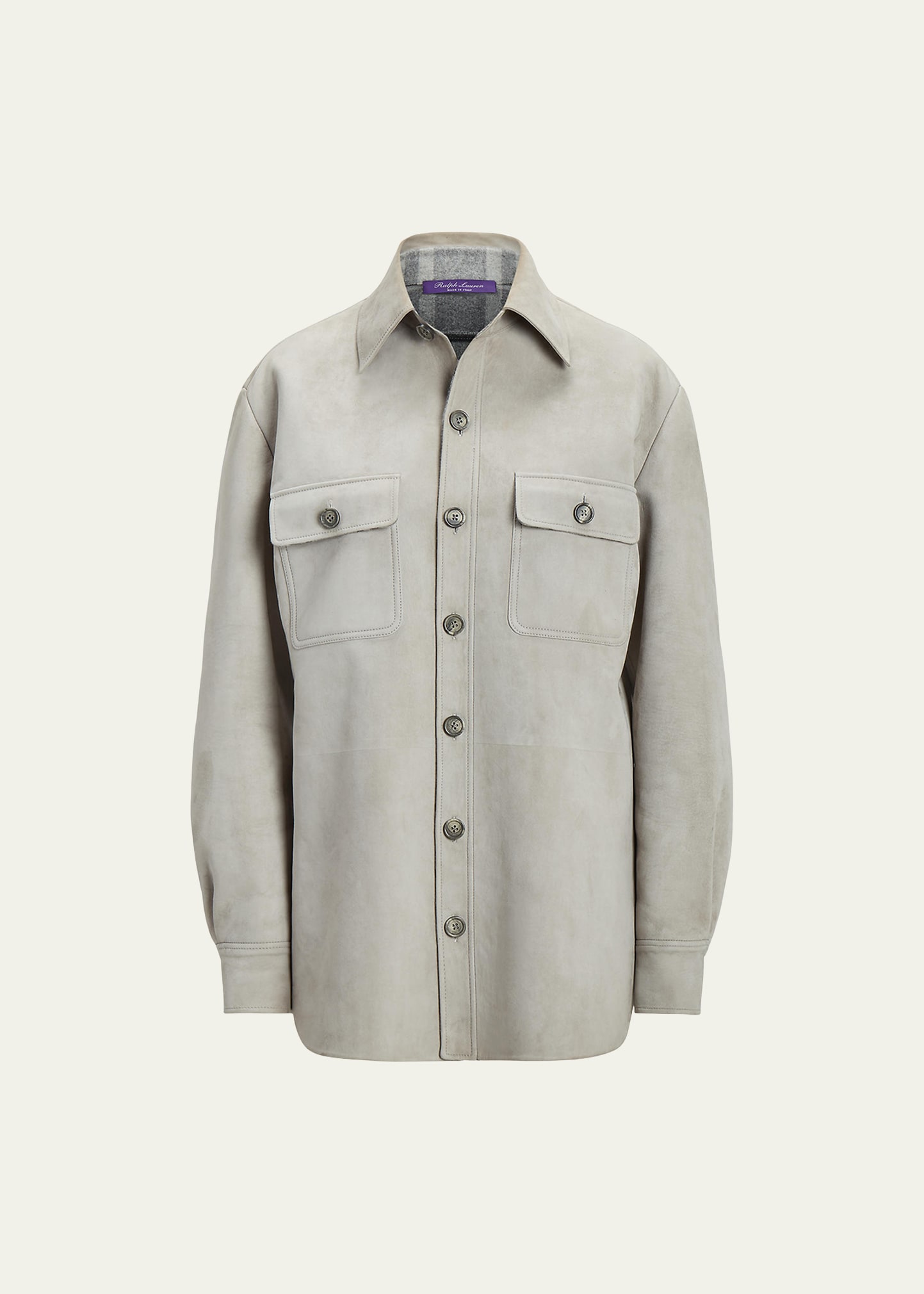 Ralph Lauren Collection "Greeleigh" shirt jacket in lambskin leather suede Spread collar; button front Long sleeves; button cuffs Chest flap-buttoned pockets Relaxed fit Wool lining Made in Italy