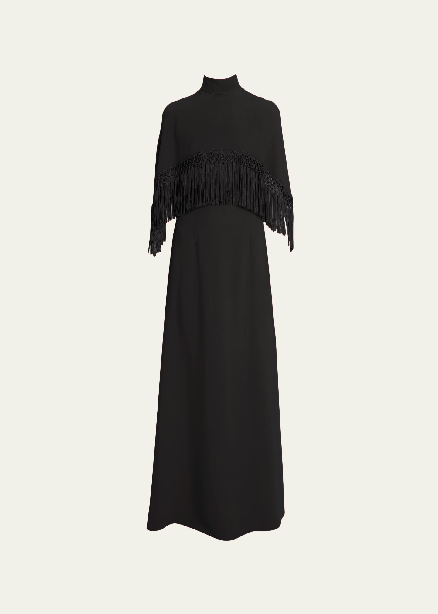 Andrew Gn crepe gown with fringe cape High neckline Three-quarter sleeves A-line silhouette Full length Back zip Viscose/acetate Polyester/viscose lining Dry clean Made in Italy