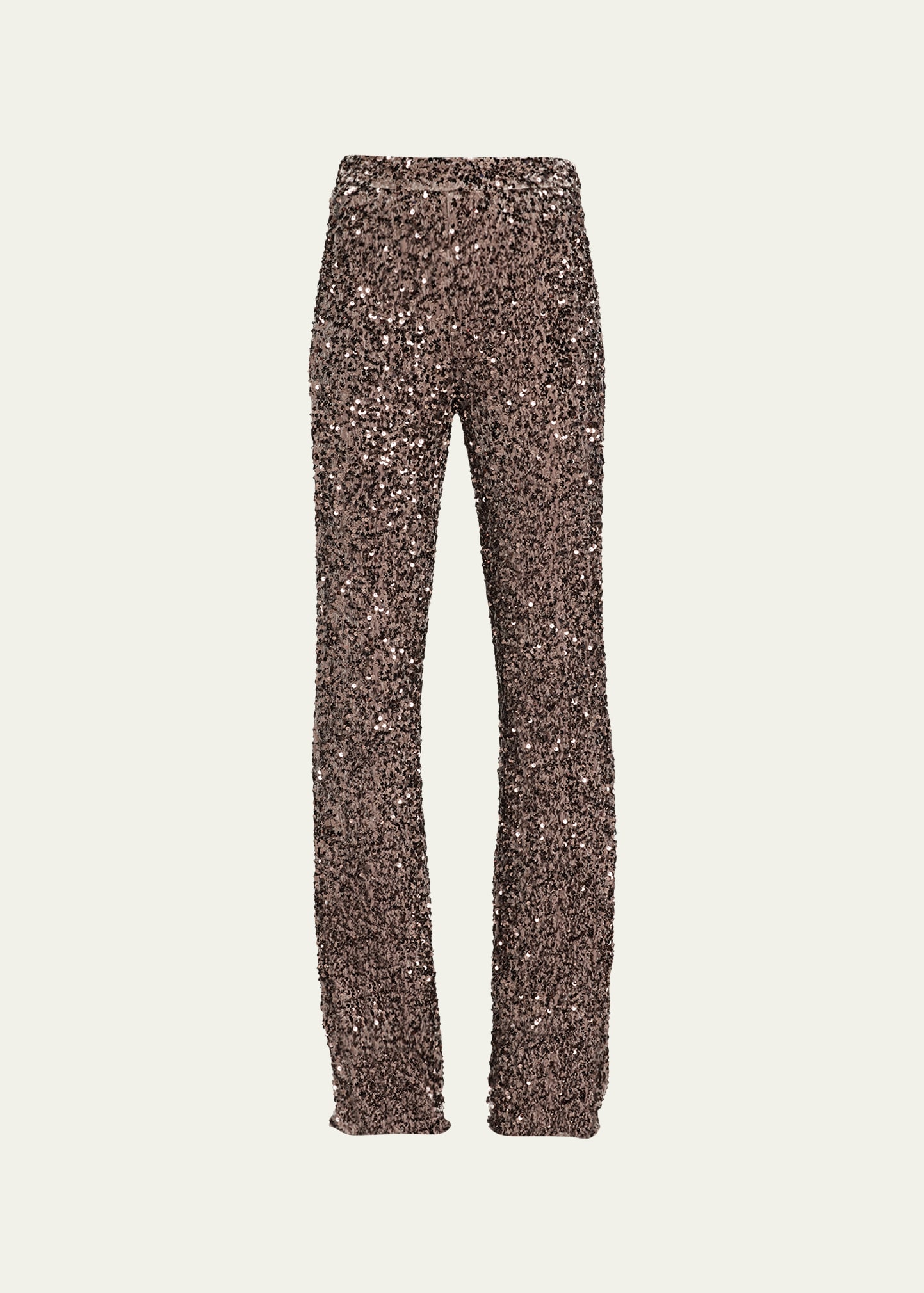 Badgley Mischka Collection velvet pants with allover sequins Approx. measurements: 10" rise; 33" inseam; 43.5" outseam High rise waist Flat front Full length Boot-cut legs Invisible side zipper Polyester/spandex Lining: Polyester Spot clean Imported