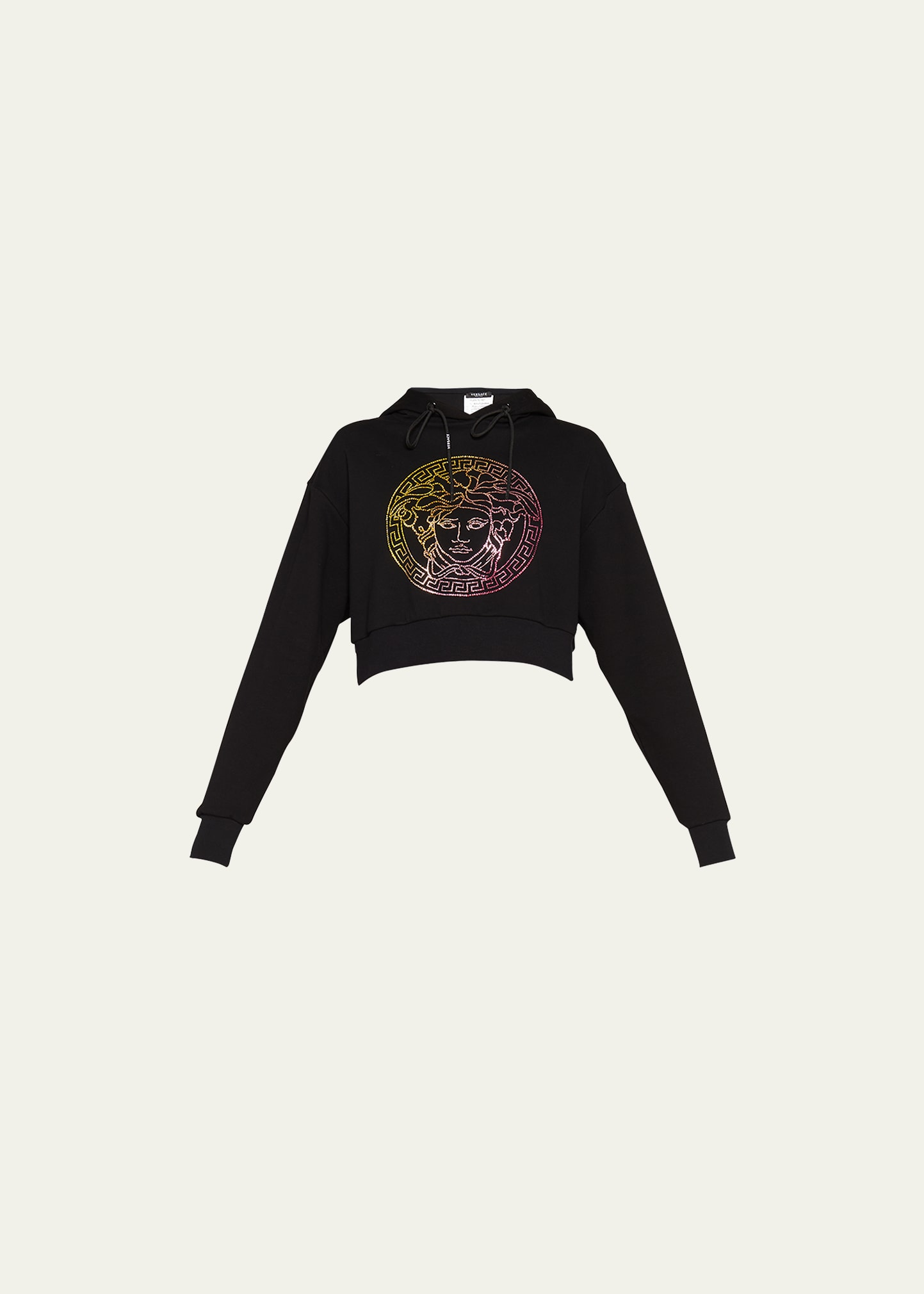 Versace hooded sweatshirt with a rainbow medusa logo on front made from rhinestones Drawstring hood Long sleeves Ribbed cuffs and hem Cropped hem Cotton Made in Italy