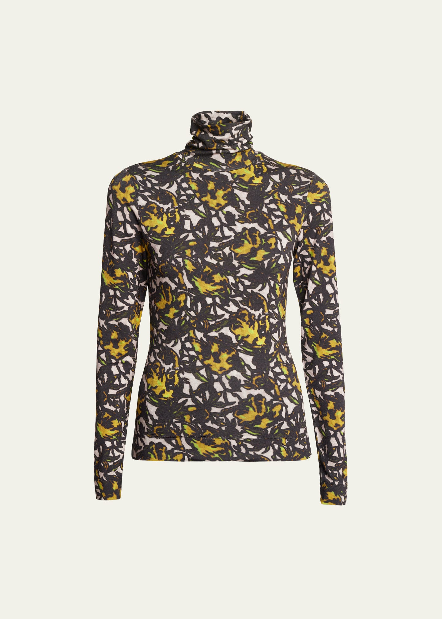 Dries Van Noten "Hosk" jersey-knit top in an allover floral pattern Turtleneck Long sleeves Fitted Hip length Pullover style Viscose/elastane Dry clean Imported