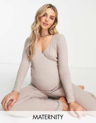 Hunkemoller maternity brushed rib wrap front top and wide leg pants pajama set in oatmeal-Multi