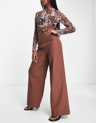 In The Style x Perrie Sian tailored wide leg pants with side split in brown-Orange