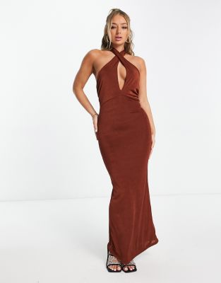 In The Style x Yasmin Devonport exclusive twist halterneck maxi dress in chocolate-Brown