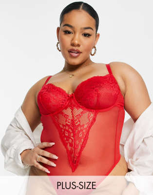 Ivory Rose Curve lace underwired mesh thong bodysuit in red