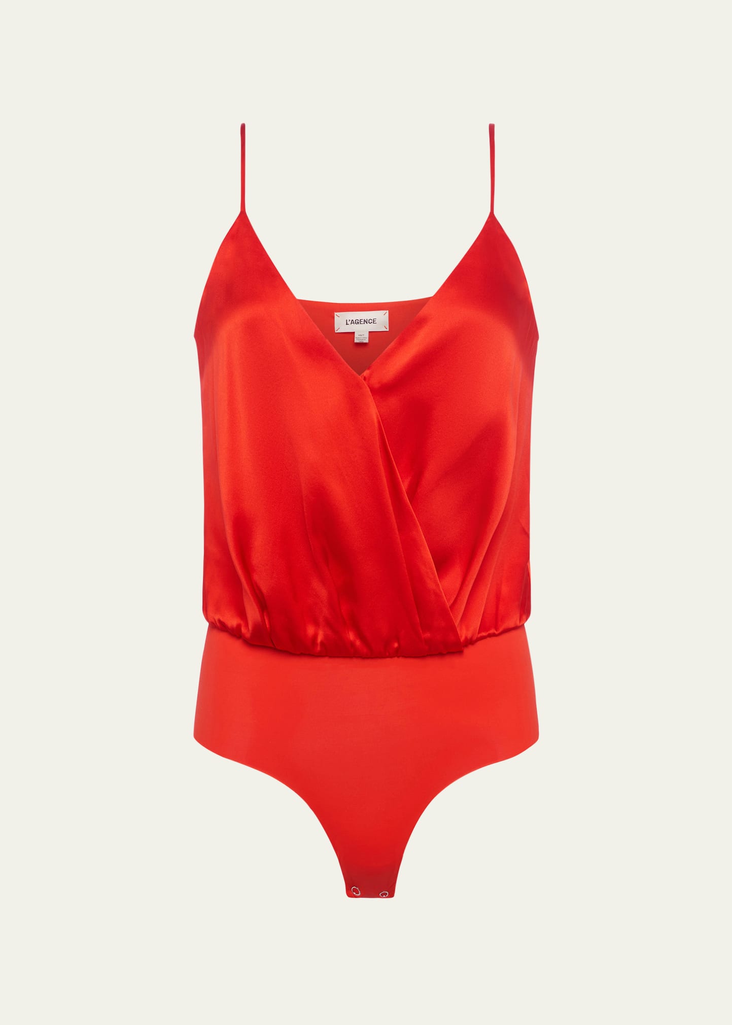 L'Agence "Jaxon" draped bodysuit with adjustable straps Plunge neckline Sleeveless Relaxed fit Snap gusset Silk Imported