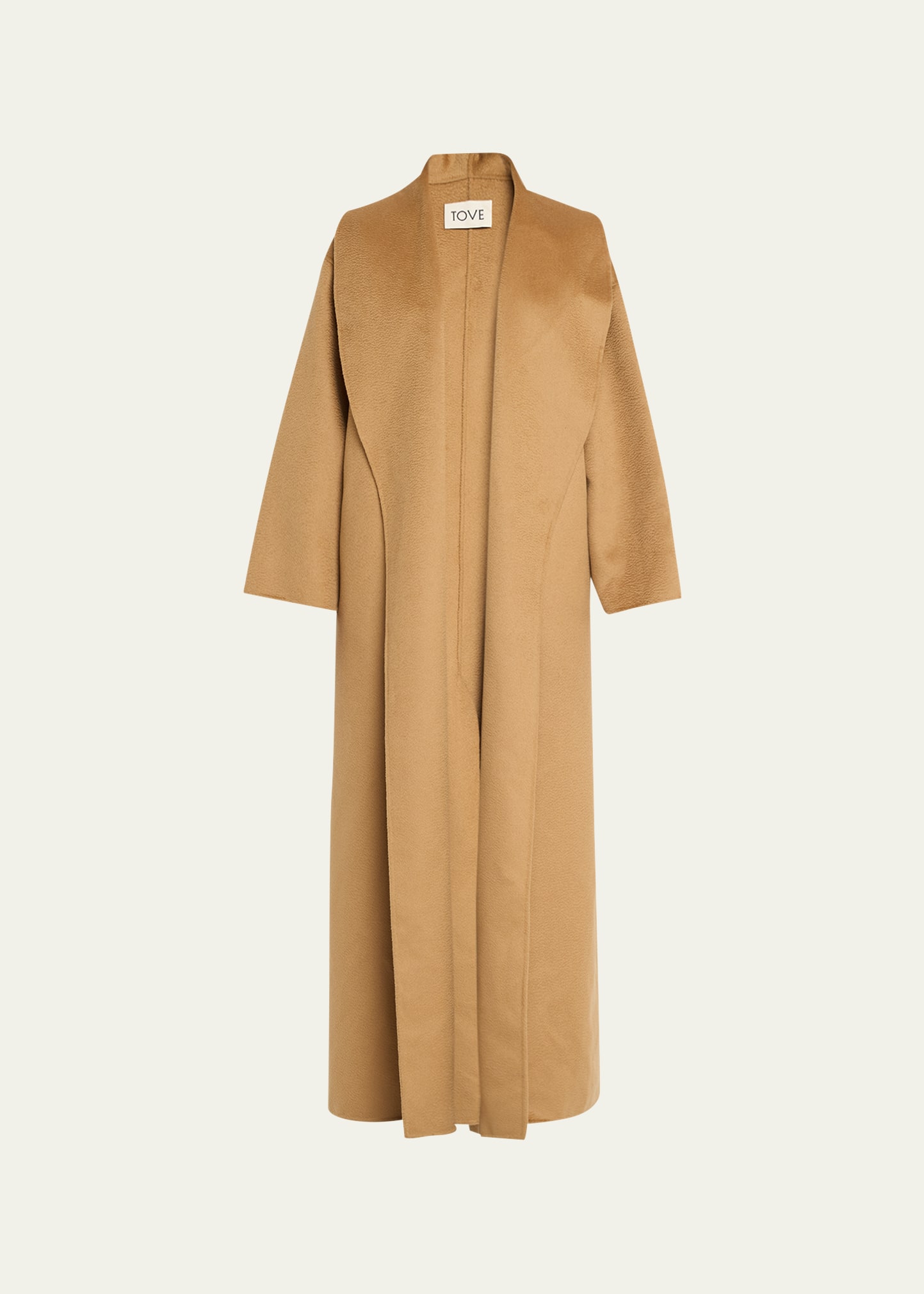Tove "Jore" coat featuring a long shawl collar and belted waist in a viscose-blend V neckline Long voluminous sleeves Boxy silhouette Open front Viscose/spandex Dry clean Imported