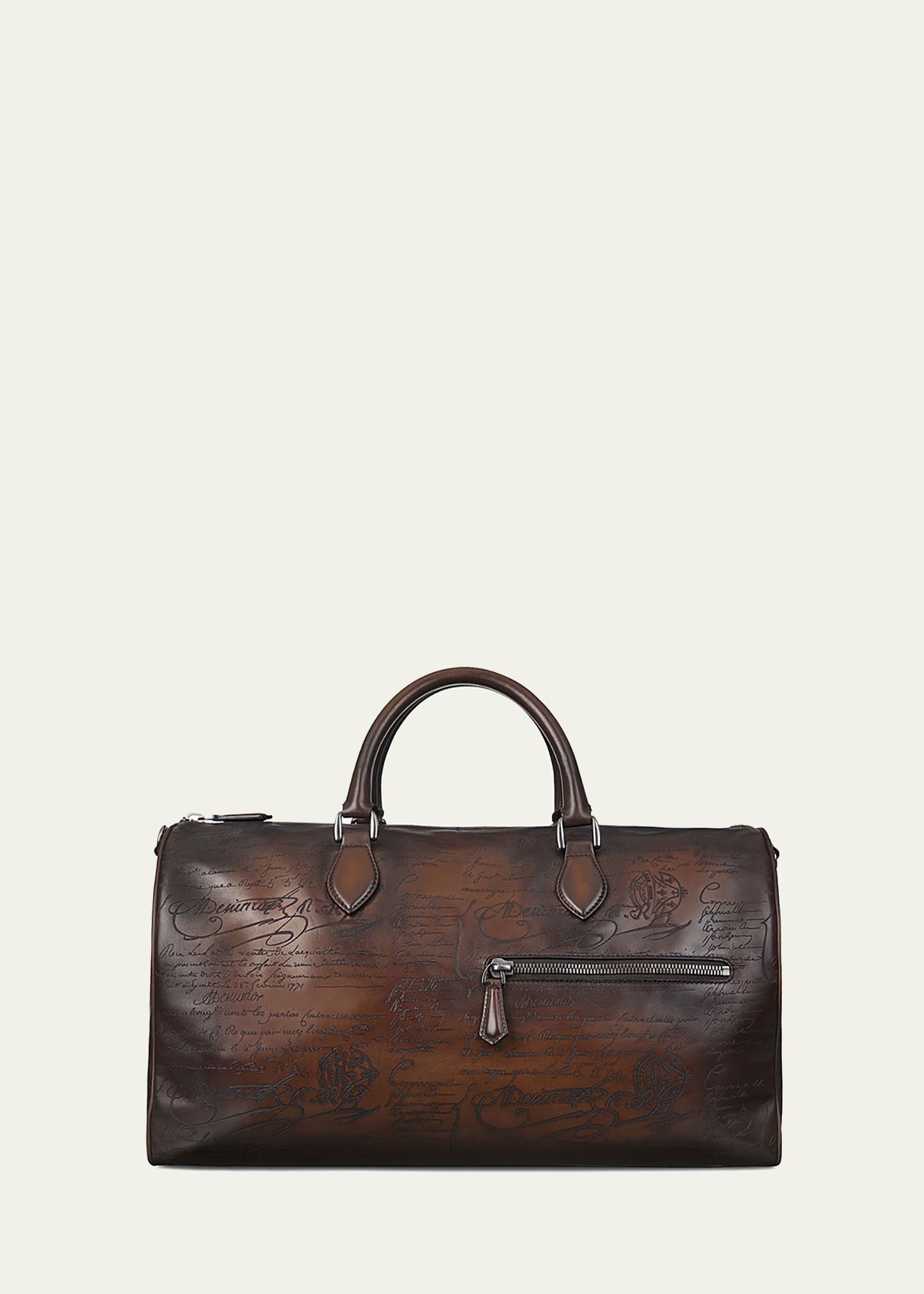 Berluti "Jour Off" duffel bag in Venezia calfskin leather with a rich, deep patina and engraved script. Brass hardware; antique finish. Turned-edge construction. Rolled top handles. Two-way zip top closure. Front zip pocket. Interior, two slip pockets, one zip pocket. 12"H x 22"W x 9.4"D. Made in Italy.