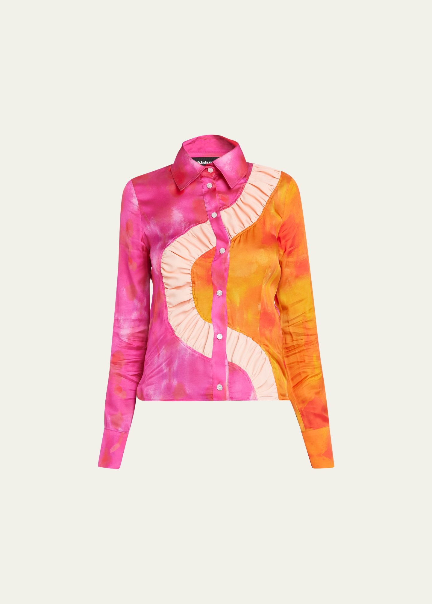 Ahluwalia "Kati" button-front shirt with ruched detailing Point collar Long sleeves; button cuffs Fitted silhouette Hem falls to the hip Viscose/acetate Dry clean Imported
