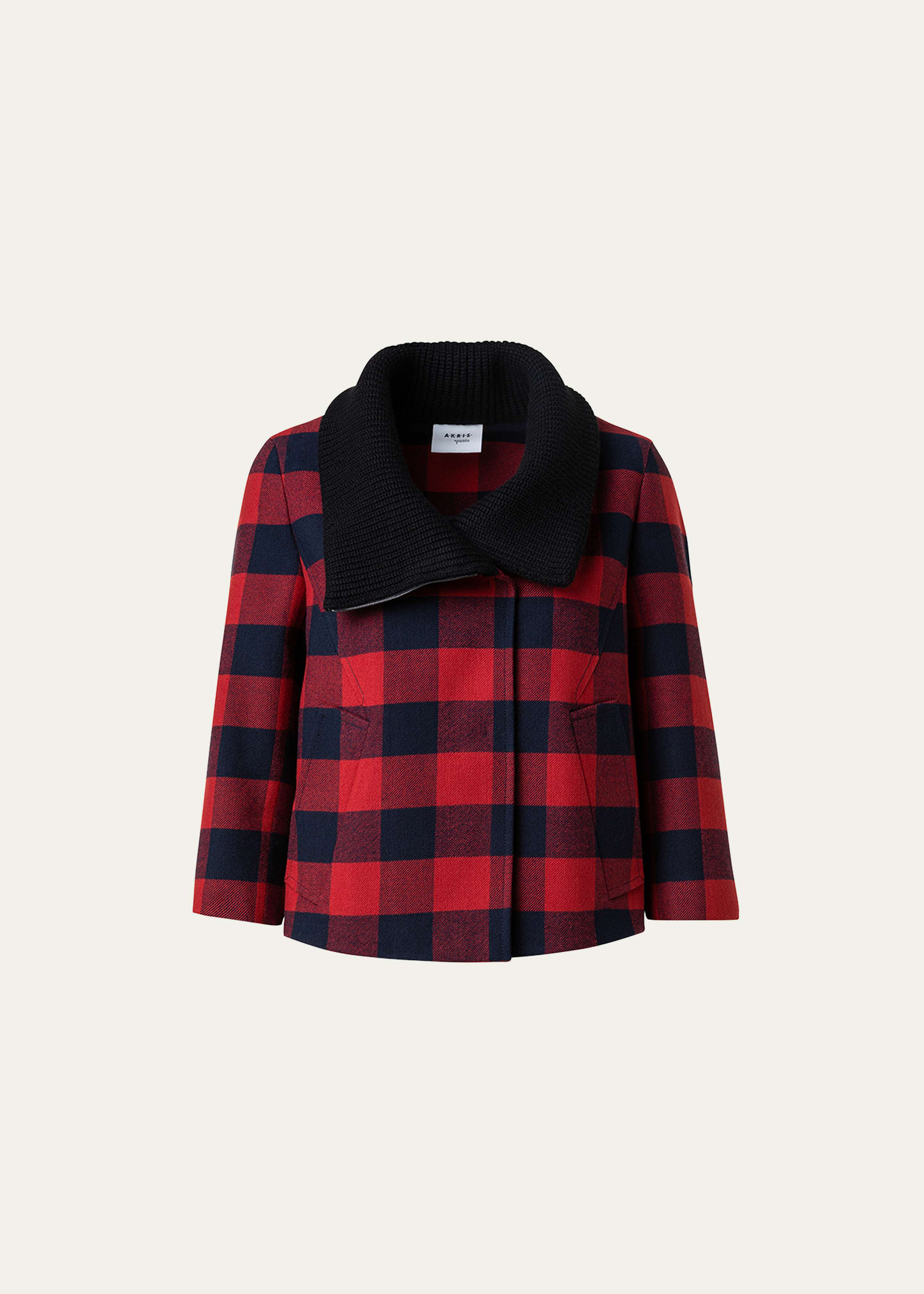Akris punto gingham tweed jacket features an exaggerated rib-knit collar Stand collar; press stud closure Three-quarter sleeves Slash front pockets Relaxed fit Sits at the hips Wool/cotton Made in Romania