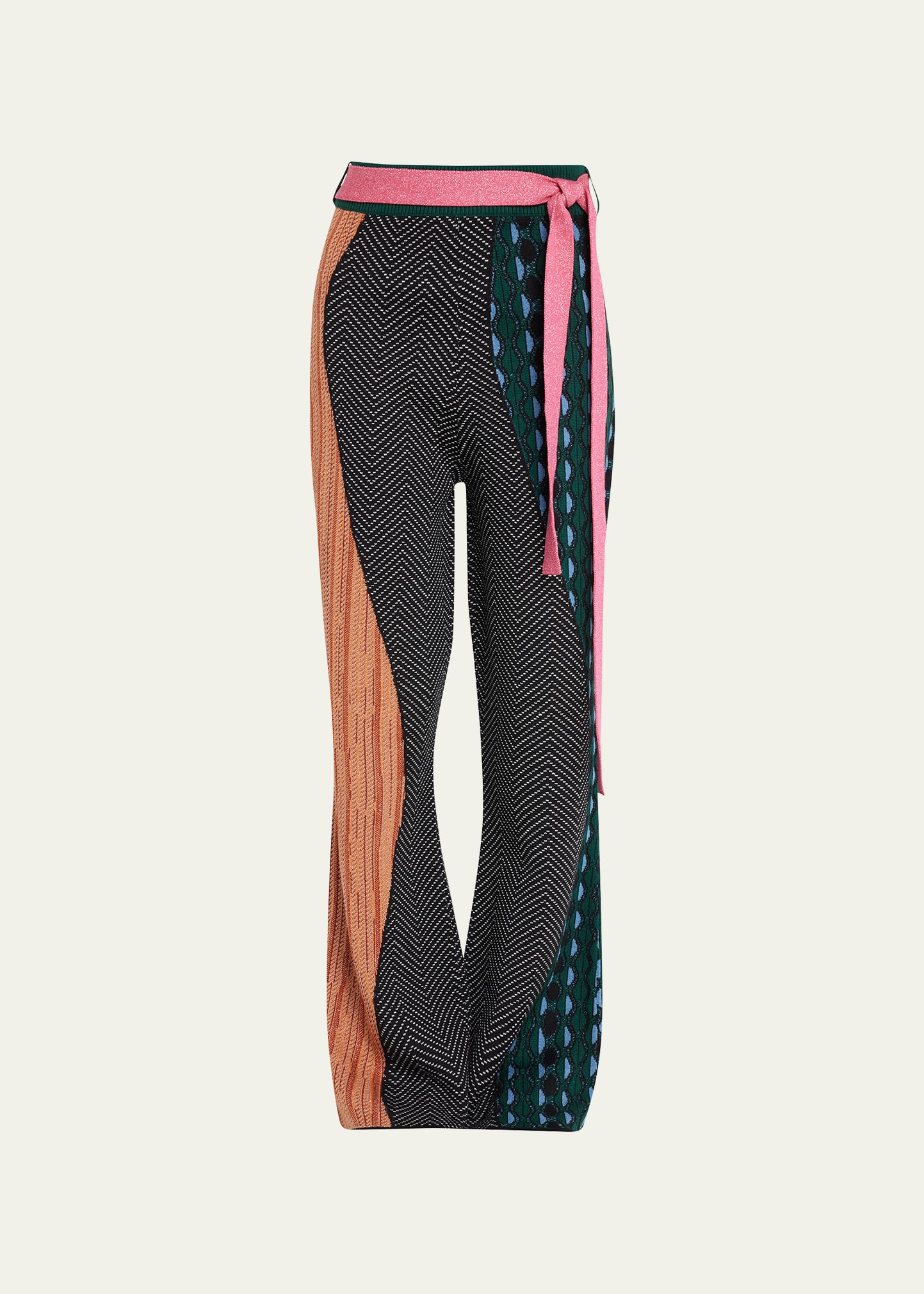 Ahluwalia patchwork trousers featuring a self-tie belt Approx. 10" rise; 34" inseam; 41" outseam Elastic waistband High rise Wide legs Full length Pull-on style Merino wool/polyamide/Lurex® Dry clean Imported