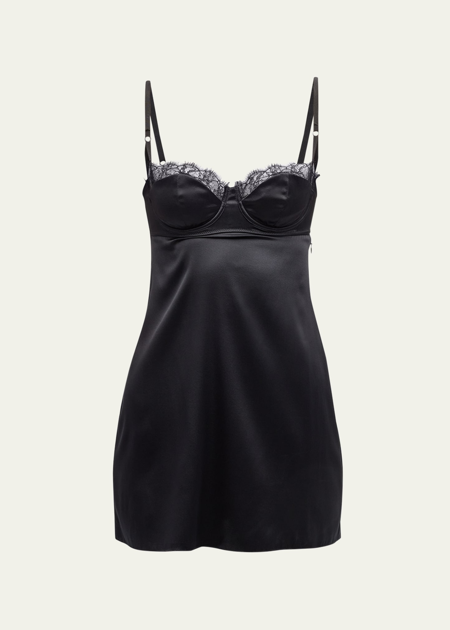 Kiki De Montparnasse nightie features lace trim along the neckline Sweetheart neckline Underwire two-part cups Sleeveless Adjustable straps Hem falls above the knee A-line silhouette Invisible side zipper Silk/spandex Dry clean Imported