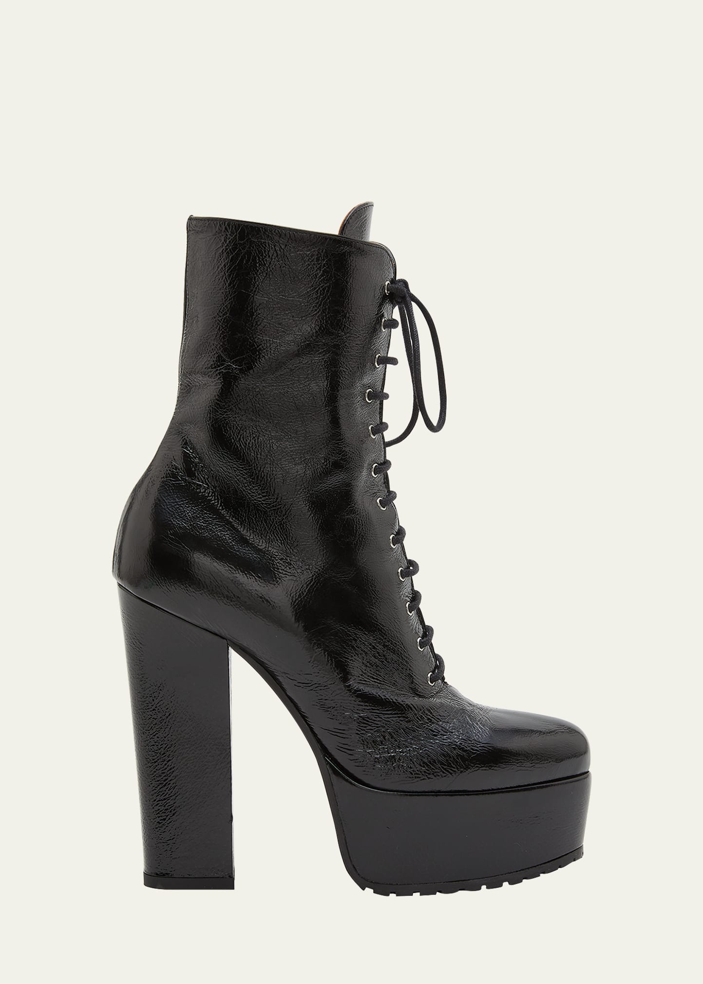 ALAIA shiny leather platform booties 5.50 in / 140 mm block heel Round toe Lace-up vamp Side zip eases dress Leather/Rubber outsole Lining: Leather Made in Italy