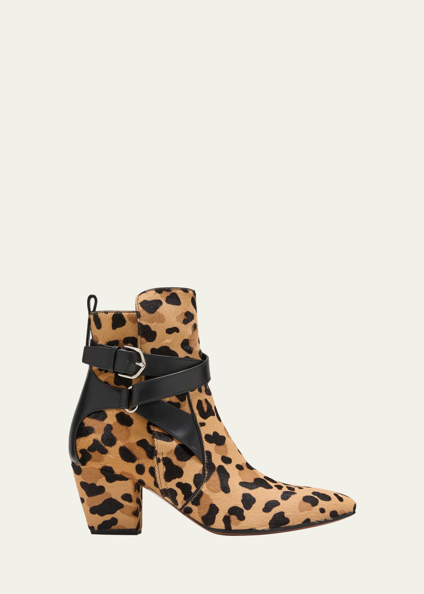 ALAIA ankle booties in leopard-print dyed calf hair (Italy) and leather 2.50 in / 65 mm covered block heel Round toe Wraparound ankle buckle strap Leather/Rubber outsole Lining: Leather Made in Italy