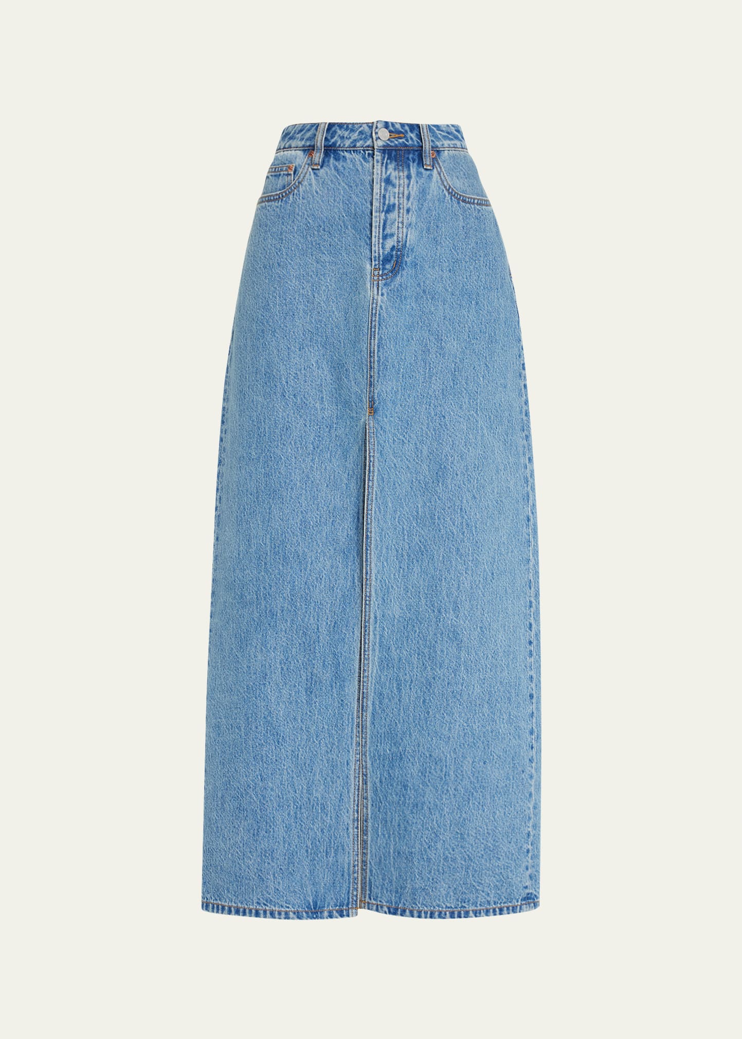 Still Here "Lima" denim maxi skirt featuring a front center slit in Five-pocket style High rise Skirt falls straight from hip to hem Full length Button/zip fly; belt loops Cotton Imported