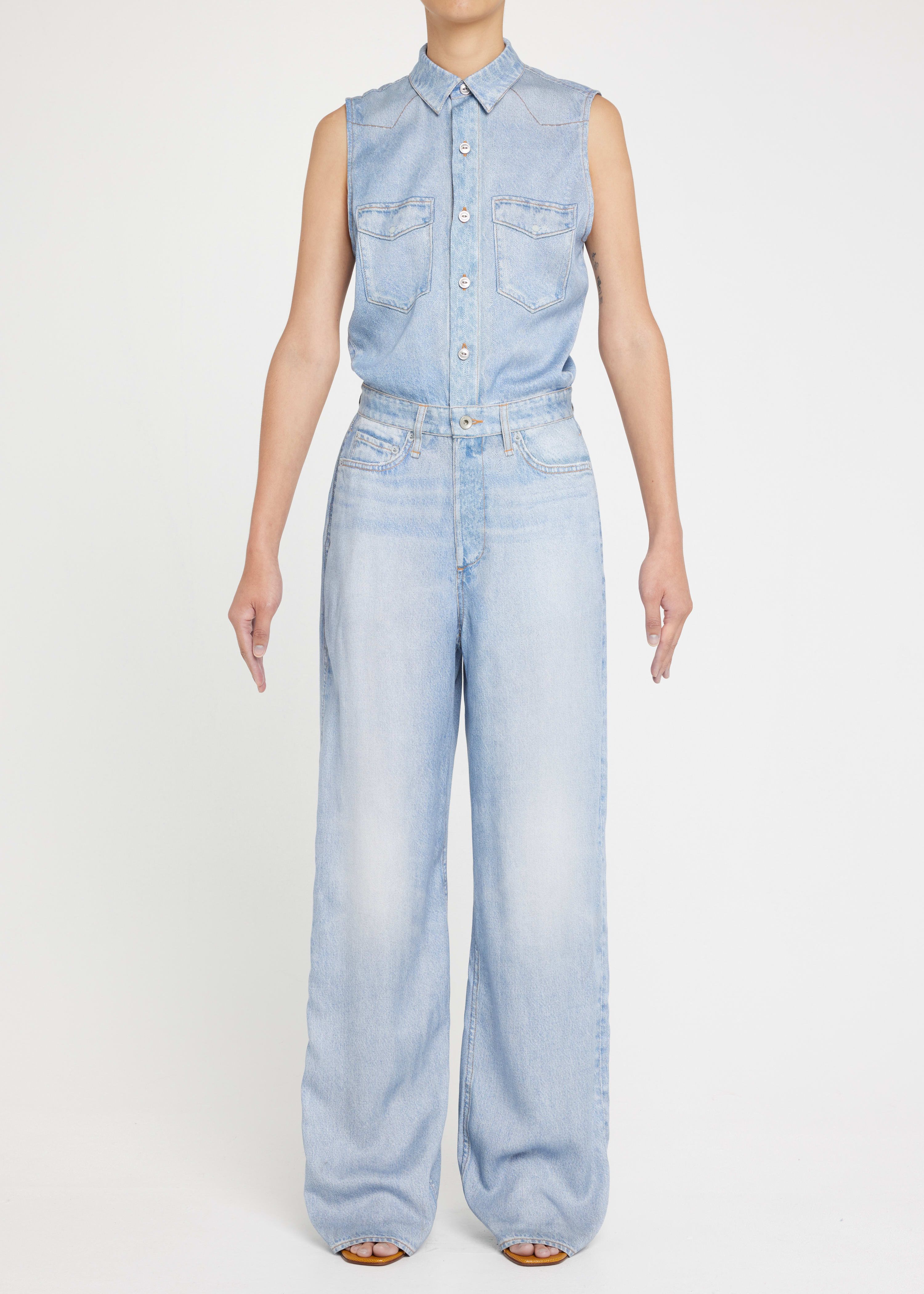 Rag & Bone liquid miramar button-front jumpsuit in a denim-printed cotton-terry Point collar Sleeveless Front flap pockets Loose fit Full length Tencel® lyocell Dry clean Imported