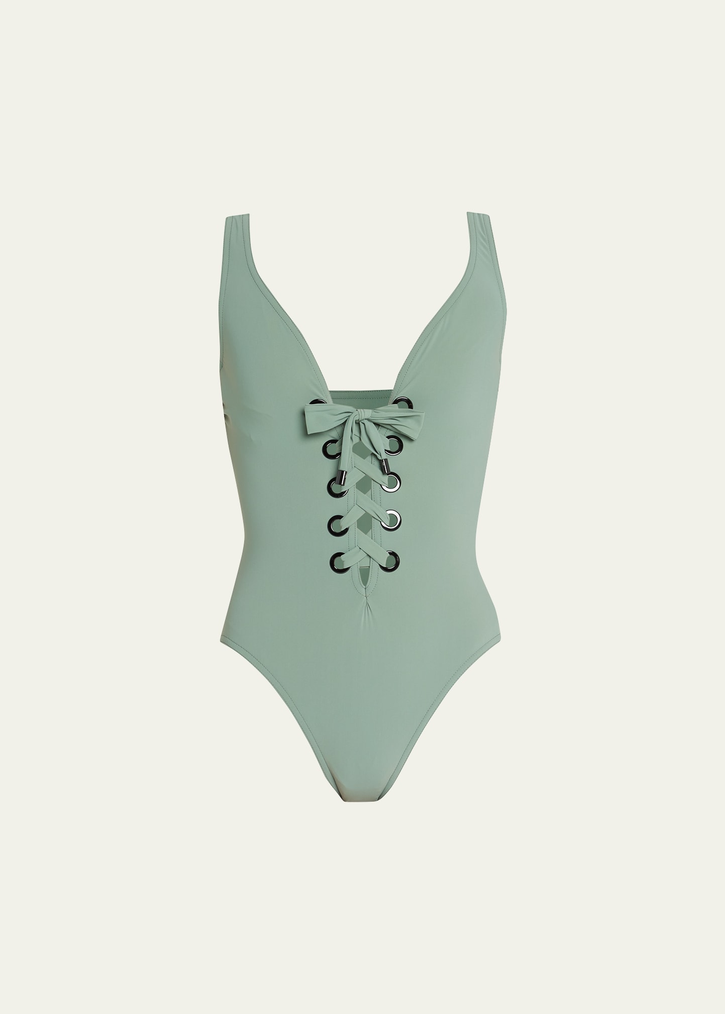 Karla Colletto "Lucy" lace-up tank one-piece swimsuit V neckline balances figure Silent built-in underwire Low-scoop back Full seat coverage Nylon/Xtralife lycra® spandex Made in USA from imported materials