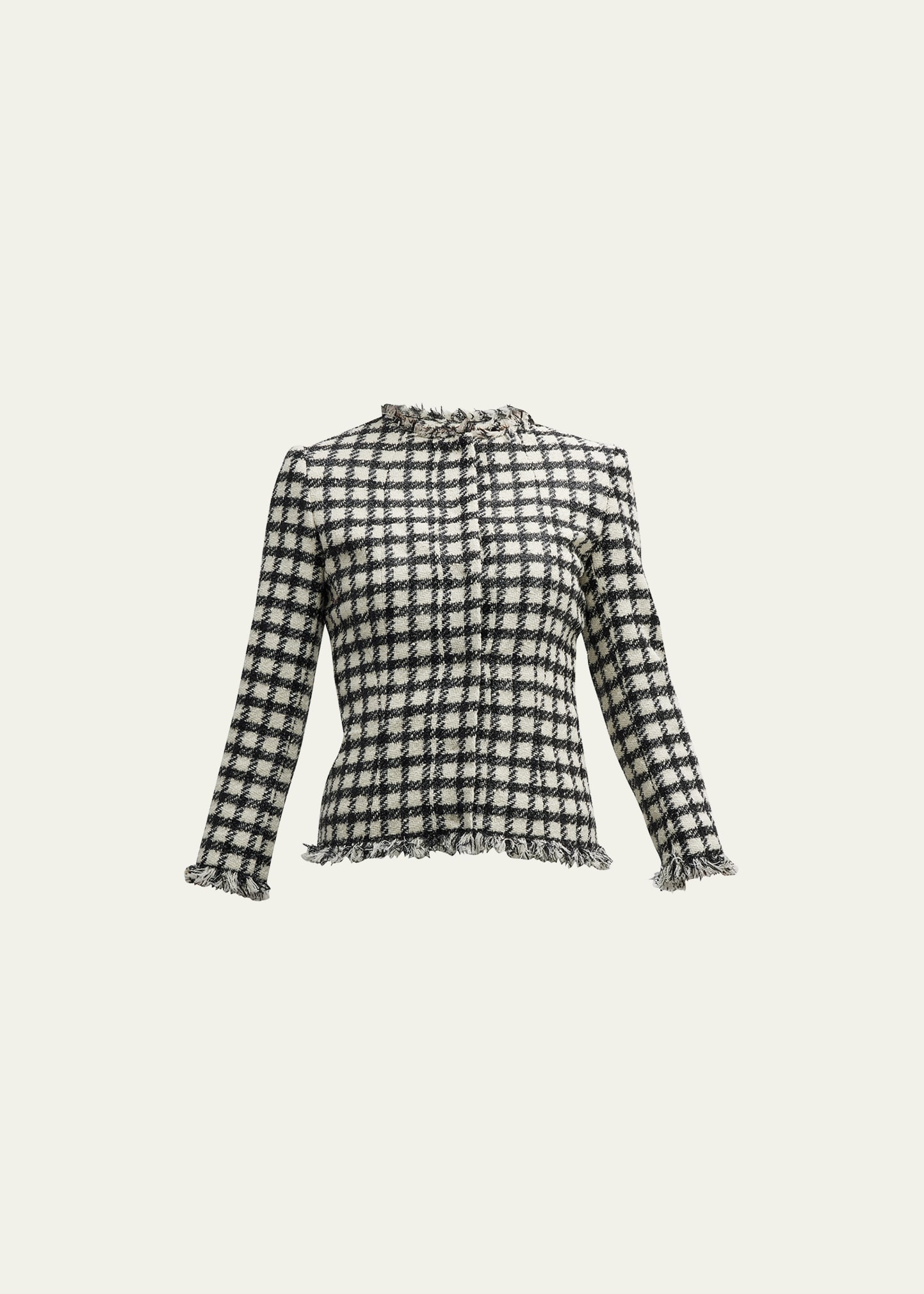 Oscar de la Renta lurex check printed tweed stroller jacket Round collar Concealed button front Long sleeves Hip length Tailored silhouette Virgin wool/polyester/nylon Lining: Silk Made in Italy