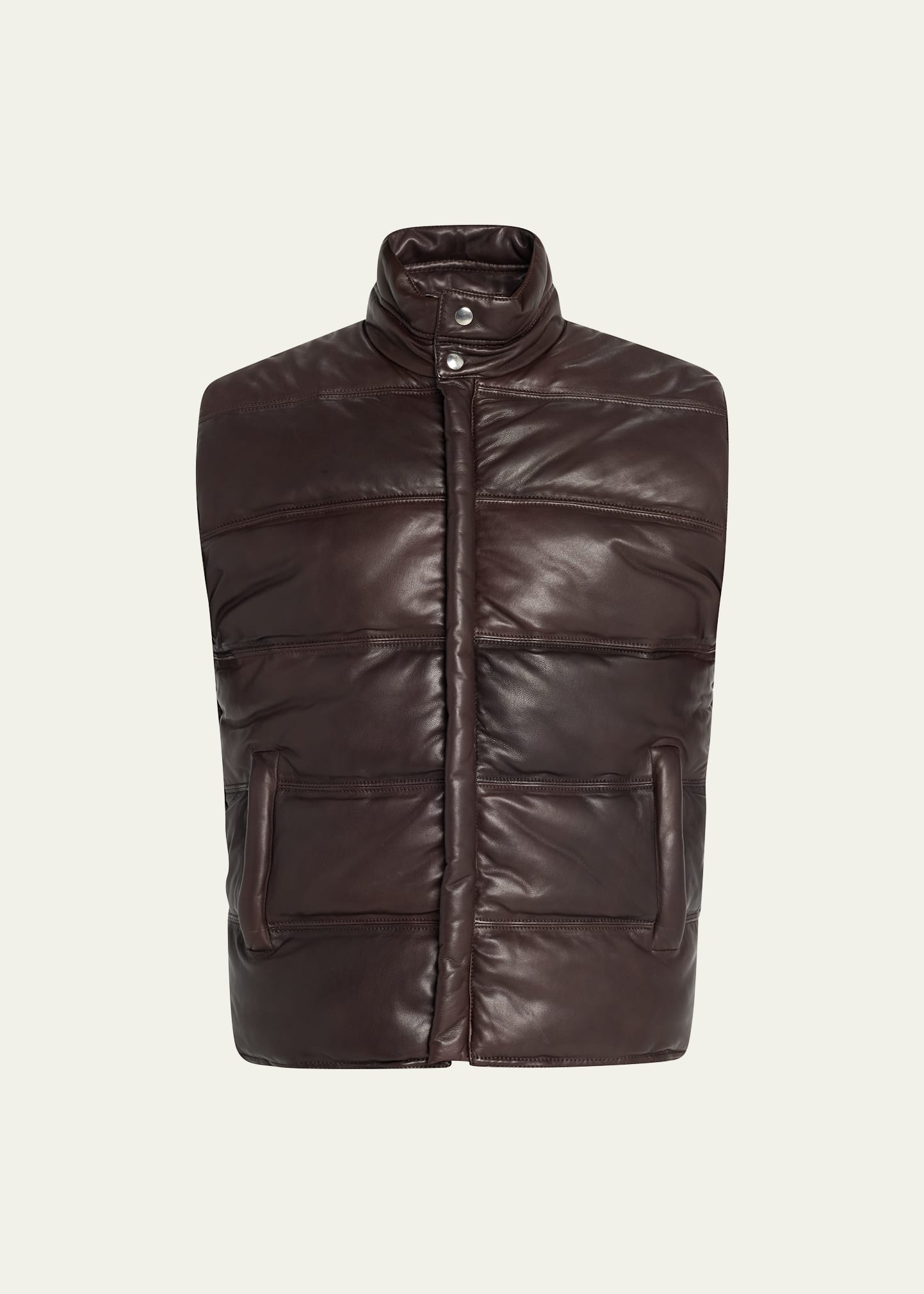 Nili Lotan "Cormac" puffer vest in smooth, supple lambskin leather Stand collar with snap front closure Zippered welt pockets Sleeveless Fill: Polyester Imported