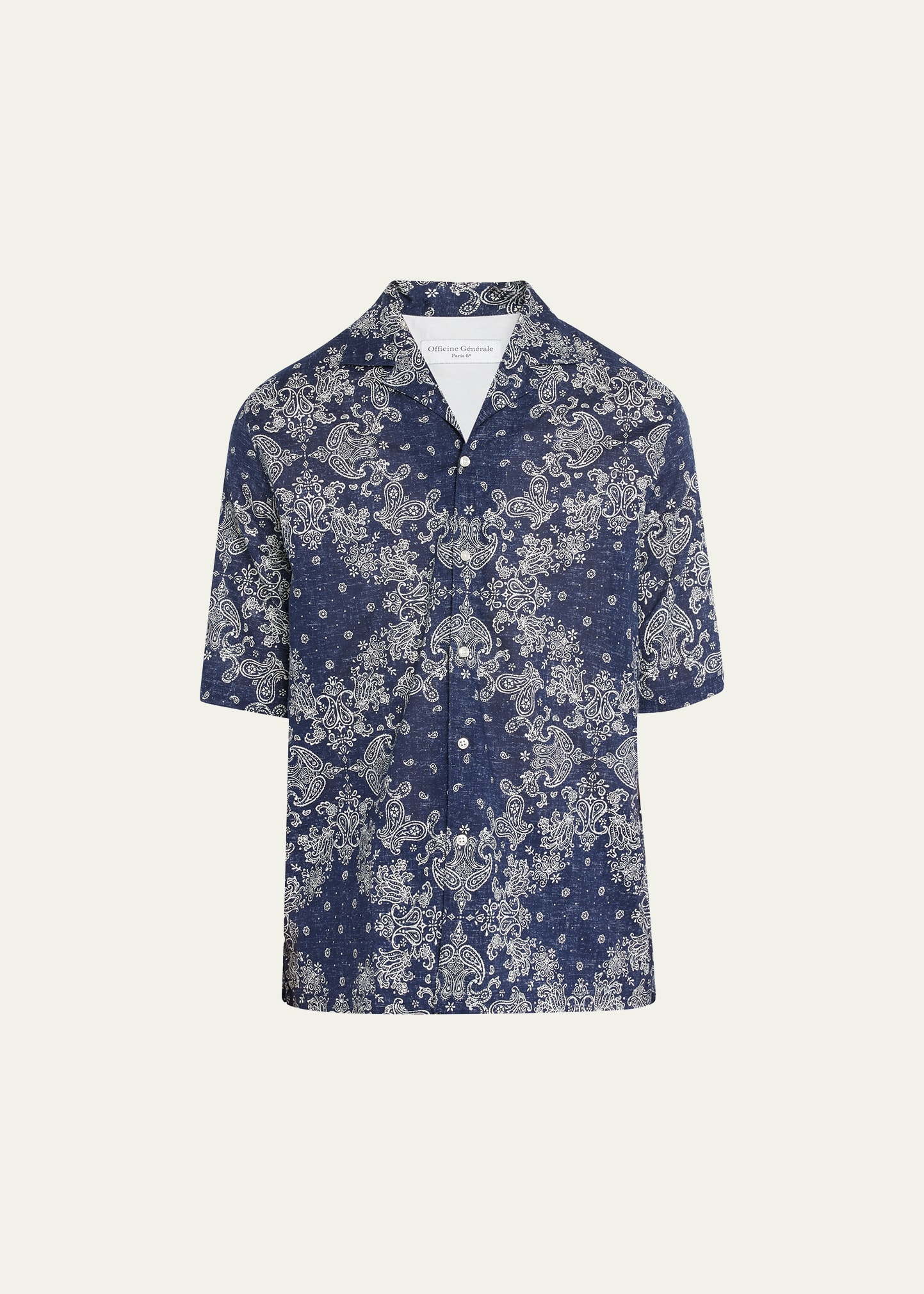 Officine Generale "Eren" camp shirt in patchwork bandana print Notched collar; button placket Short sleeve; approx. 12.0"L Straight hem Yoked back shoulders Cotton Made in Portugal