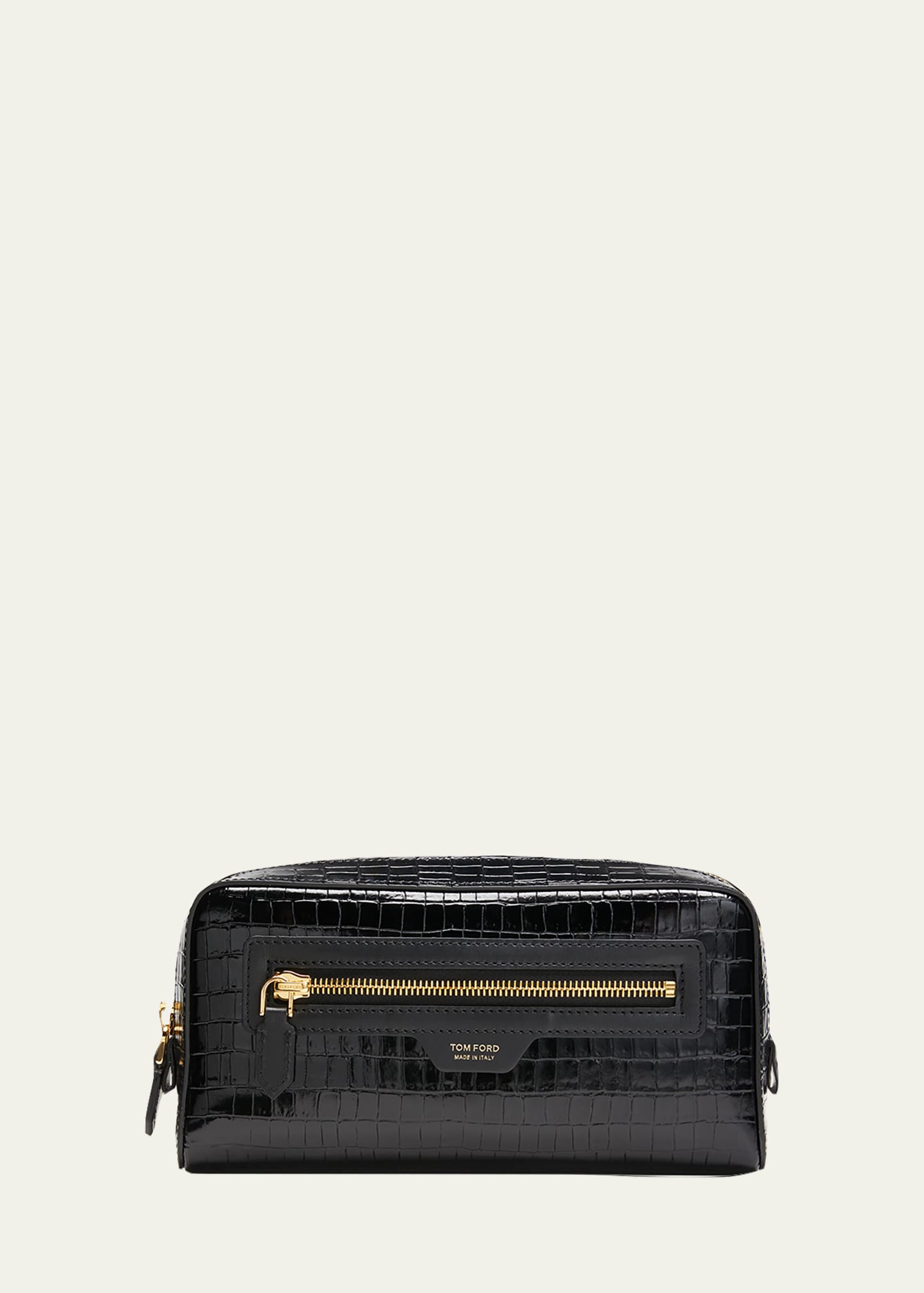 TOM FORD toiletry pouch bag in glossy croc-embossed calf leather with gold-tone brass hardware Approx. 9.8"L x 4.72"H Zip closure Front zip pocket Gold-tone logo lettering at front Internal slip pocket Made in Italy