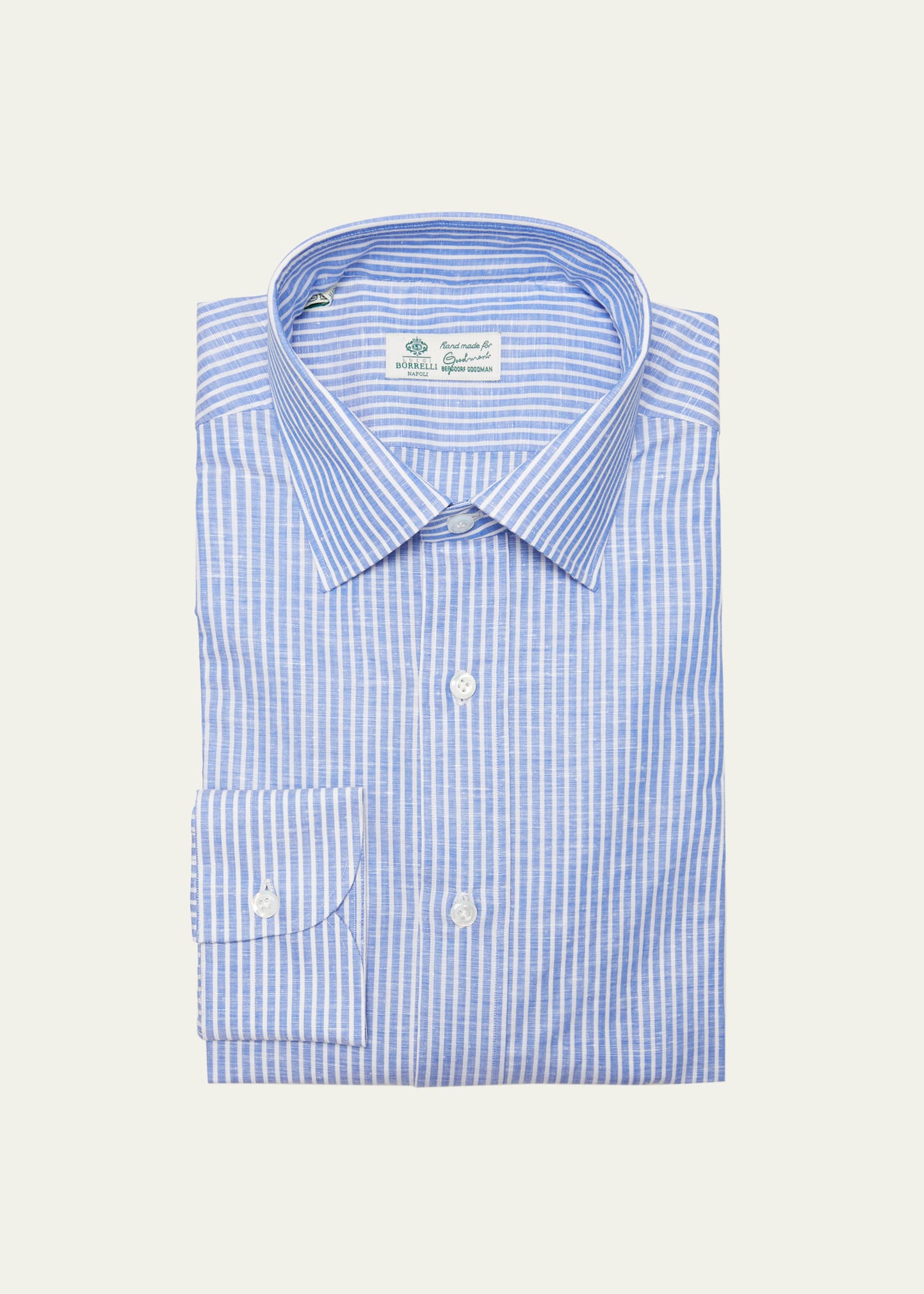 Borrelli stripe dress shirt in breathable, lightweight linen Point collar; button placket Long sleeves Round barrel cuffs Yoked back shoulders Shirttail hem Made in Italy