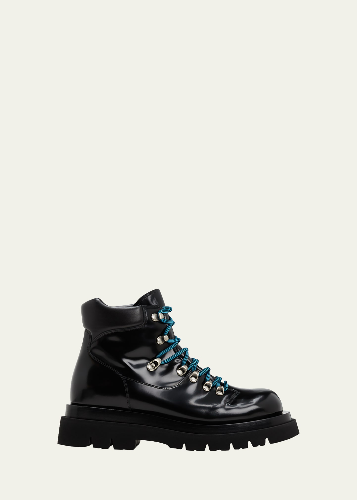 Bottega Veneta ankle boots with glossy calf leather upper Chunky heel; approx. 2.2" flatform Round toe Lace-up vamp Padded collar Chunky lug-patterned rubber sole Made in Italy