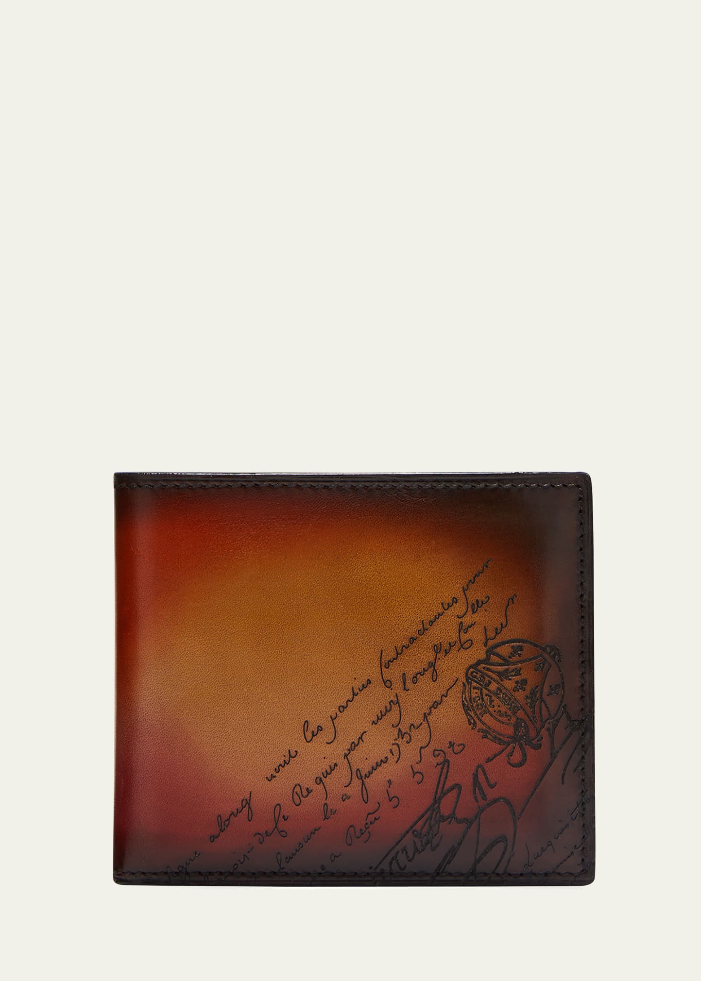 Berluti billfold wallet in leather with signature Scritto accents Eight card slots Two side slip pockets One note compartment Approx. 4.3"H x 3.7"W Made in Italy