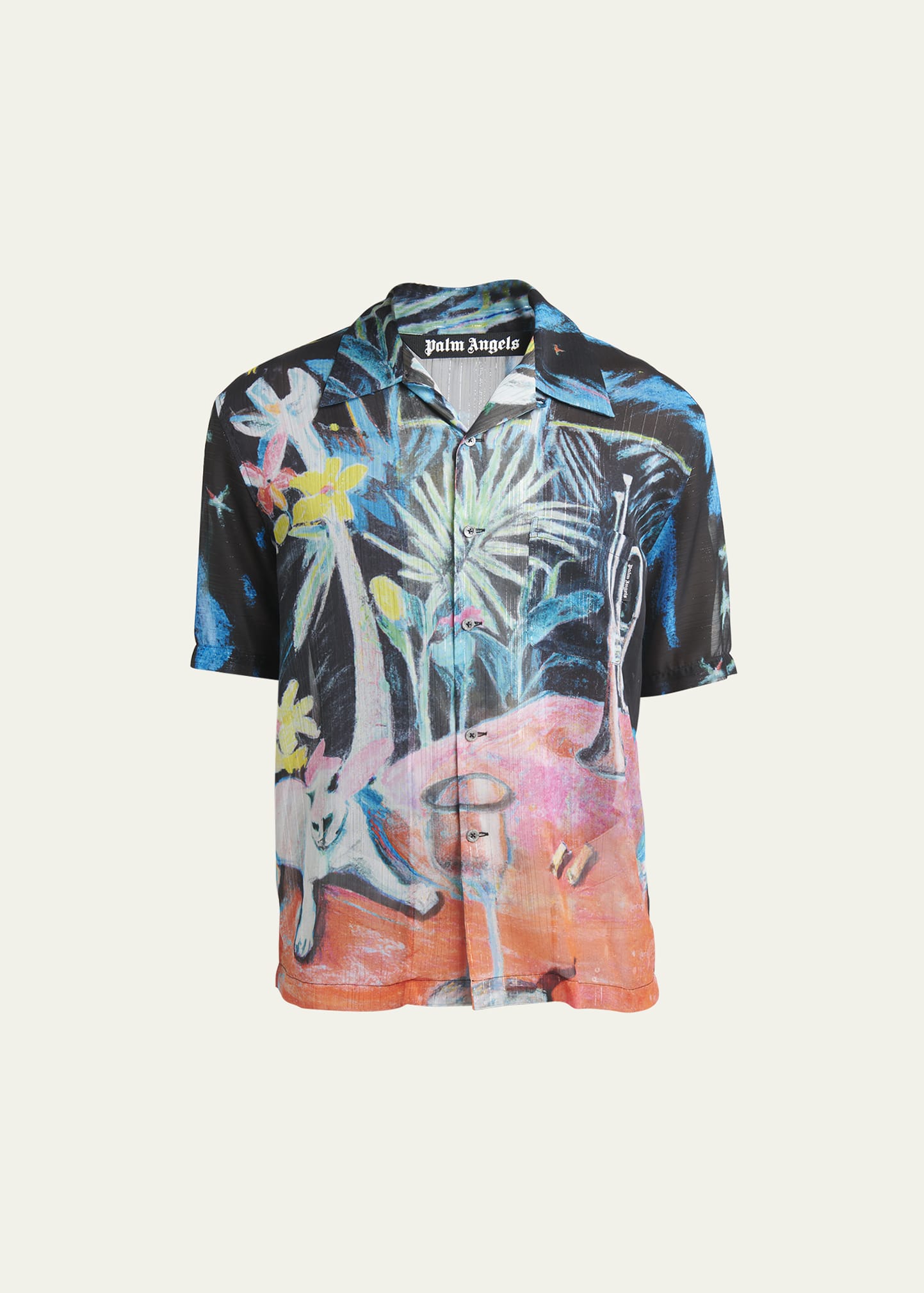 Palm Angels camp shirt in sheer oil on canvas artwork print Spread collar; button placket Patch pocket Short sleeves Straight hemline Polyester Made in Italy
