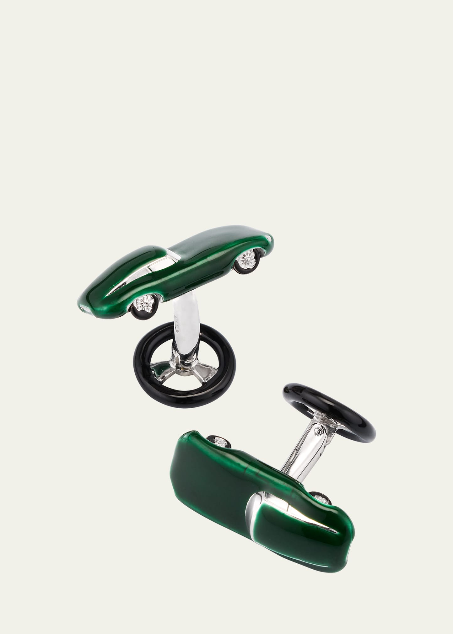 Jan Leslie set of two cufflinks feature a unique sports car design Sterling silver and enamel Steering wheel fixed backs Wipe clean Imported