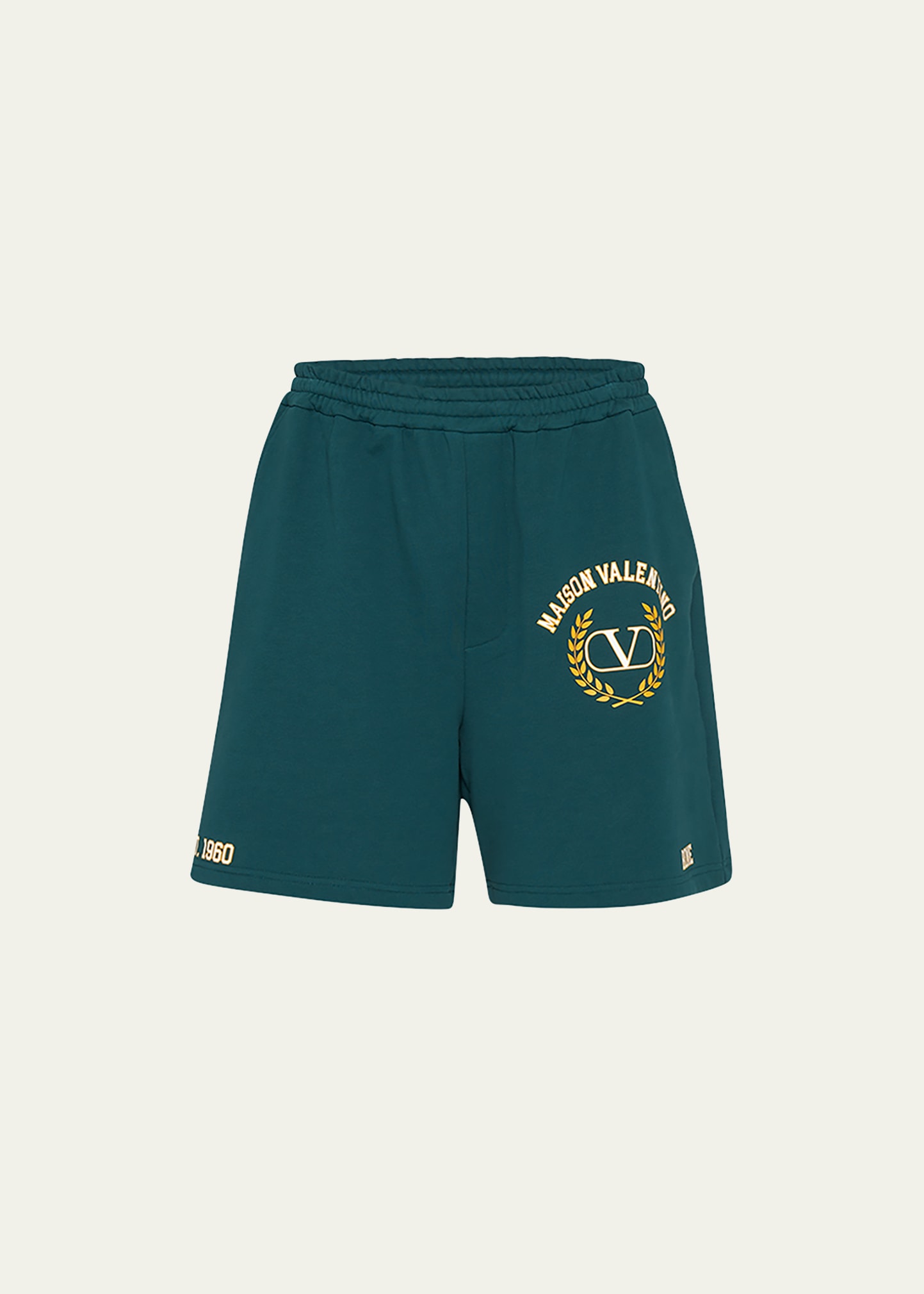 Valentino Garavani terry sweats shorts with university logo print at front Elasticized waist Flat front Side slip pockets Relaxed legs Knee length Pull-on style Cotton Made in Italy