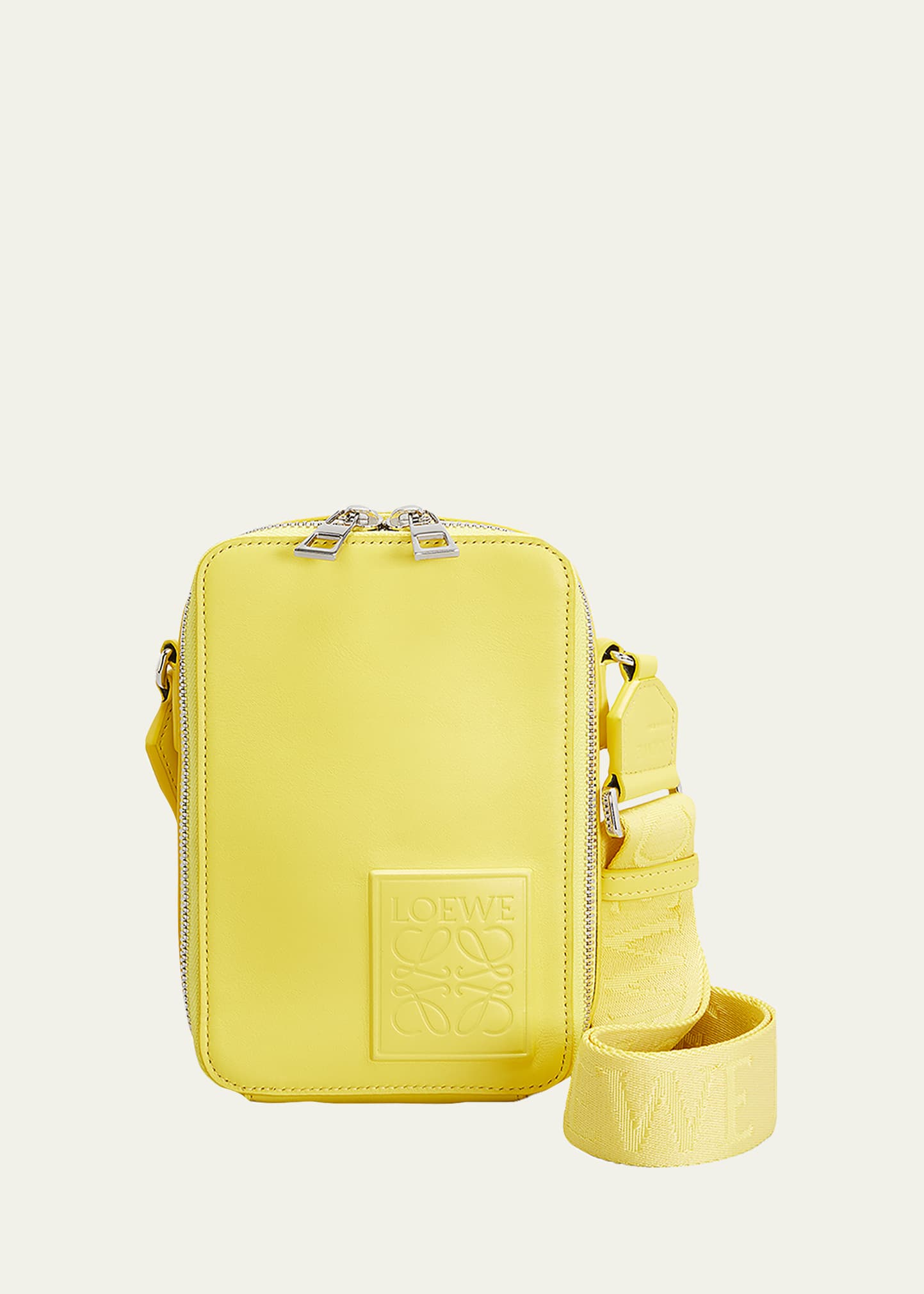 Loewe vertical crossbody bag with tonal Anagram patch at front Approx. 5"L x 2.0"W x 8"H Two-way zip closure Adjustable shoulder strap Herringbone fabric lining Calf leather/cotton/polyester Made in Spain