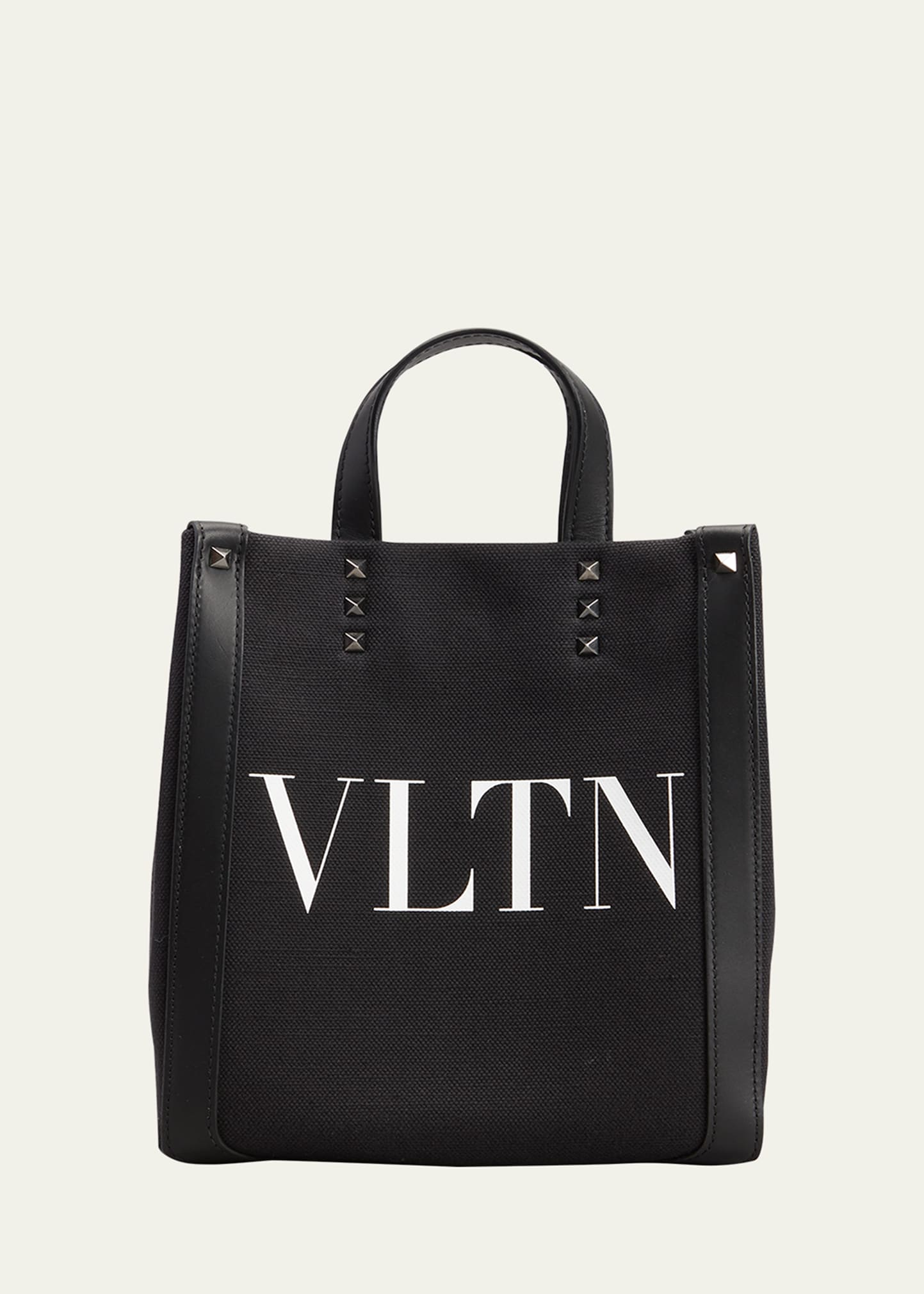 Valentino Garavani tote bag features VLTN logo print at front and square stud embellished accents Approx. 8.27"L x 3.5"W x 9.5"H Snap closure Two top carry handles Detachable adjustable shoulder strap Internal slip pocket Cotton/leather Made in Italy