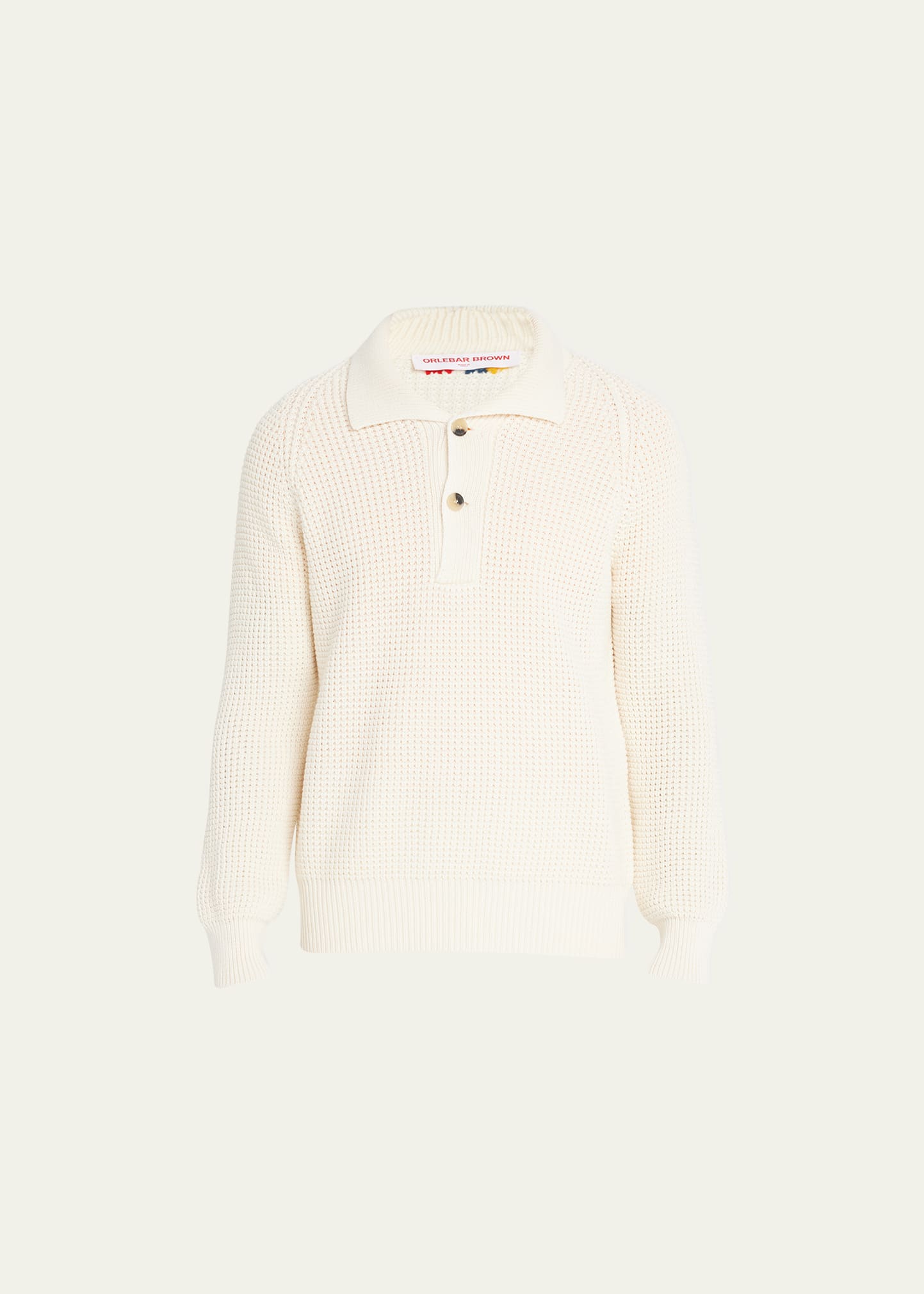Orlebar Brown sweater in shrink-resistant, 7-gauge waffle knit Spread sailor collar Two-button placket Hand-stitched embroidery stripe at back neck Classic fit Long sleeves Ribbed trim Pullover style Merino wool Made in Italy