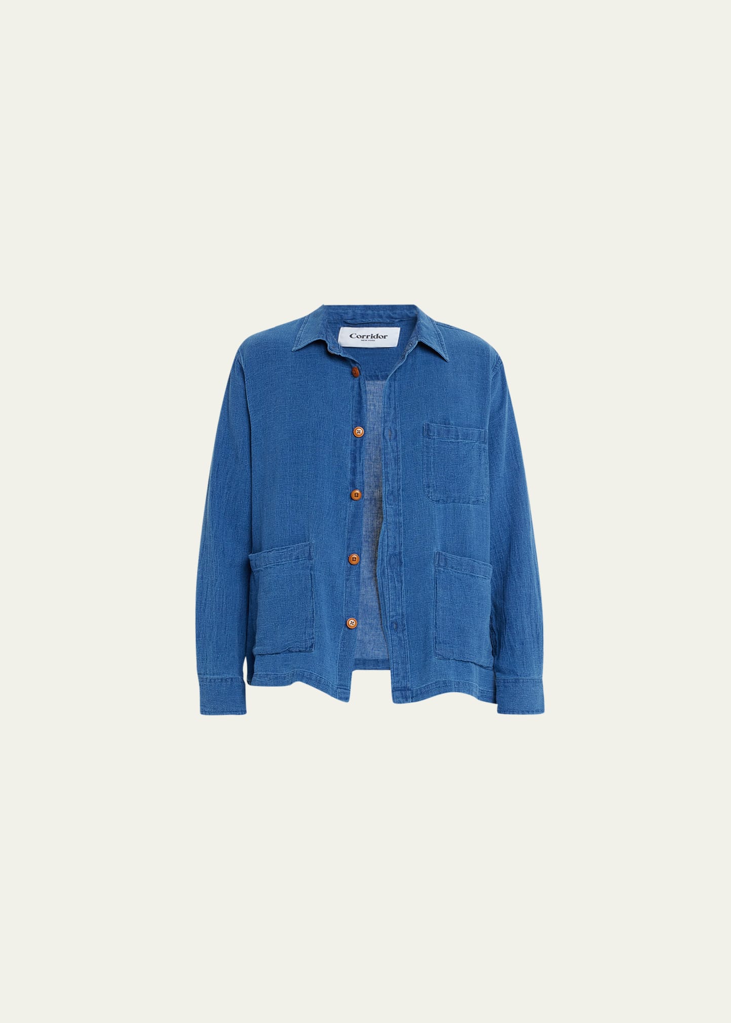 Men's washed chore jacket by CORRIDOR Spread collar; button front Three front patch pockets Long sleeves Single-button cuffs Cotton/linen Imported