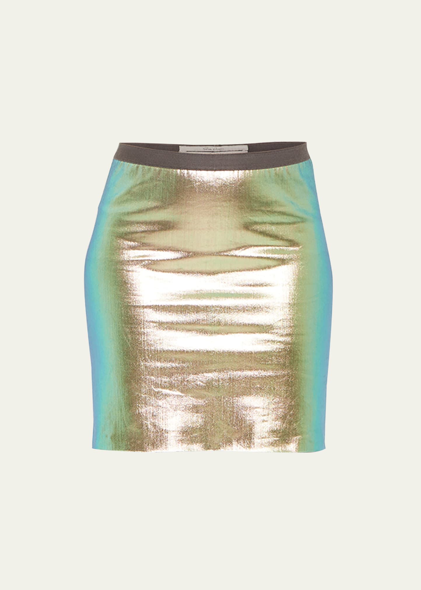 Rick Owens skirt with a metallic coating, raw hem, and an elasticized waistband High waist Body-conscious silhouette Mini length Pull-on style Cotton Unlined Professional cleaning recommended Made in Italy