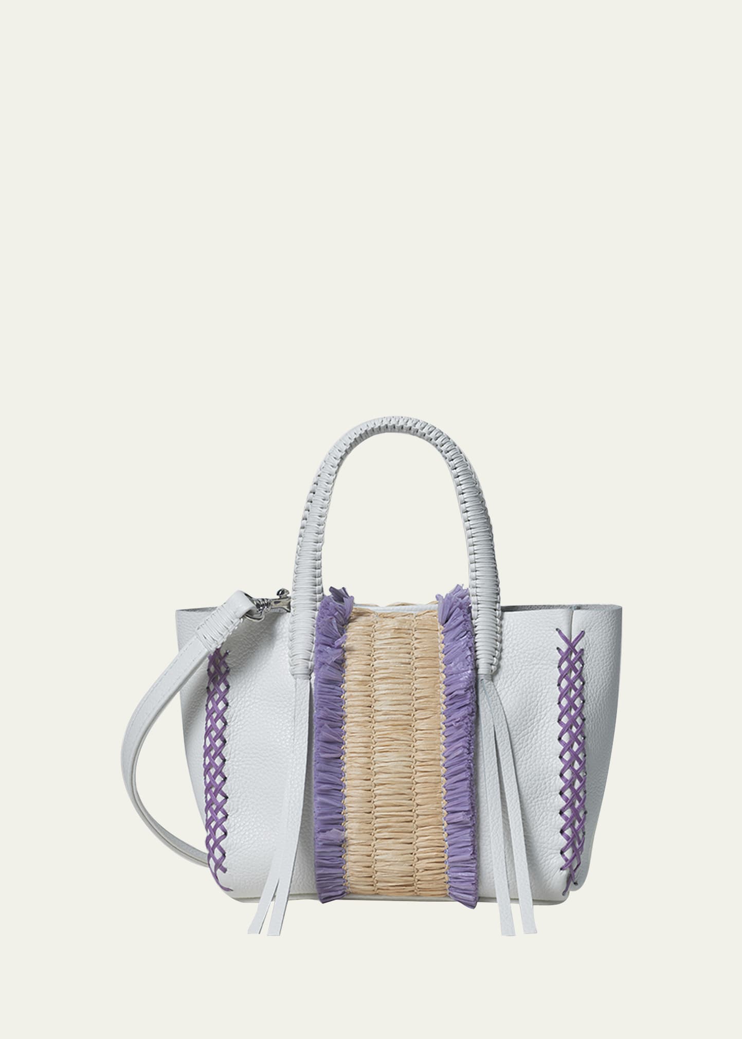 Callista calf leather tote bag with raffia trim Rolled top handles Detachable, adjustable crossbody strap, 42.5"-49.9"L Can be worn as a top handle or crossbody bag Open top with snap closure Approx. 5.9"H x 7"W x 2.8"D Made in Greece