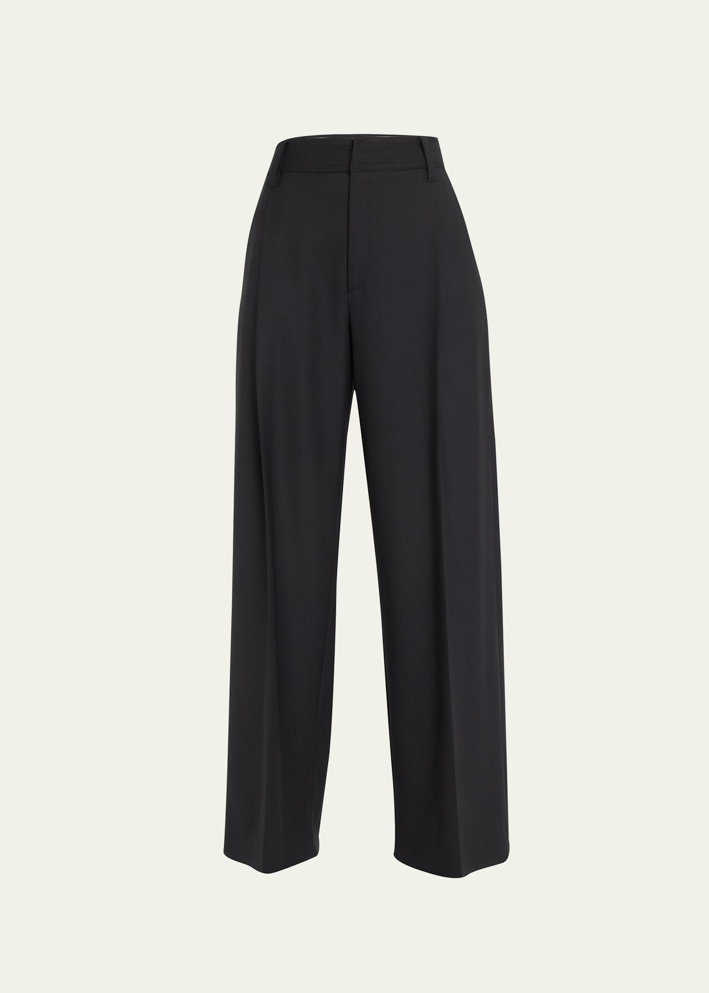 MARIA MCMANUS stretch wool trousers with pleated front Approx. measurements: 13.1" rise; 31" inseam Mid rise Side slip pockets; back welt pockets Straight legs Full length Tab/zip fly; belt loops Wool/elastane Made in USA from imported materials