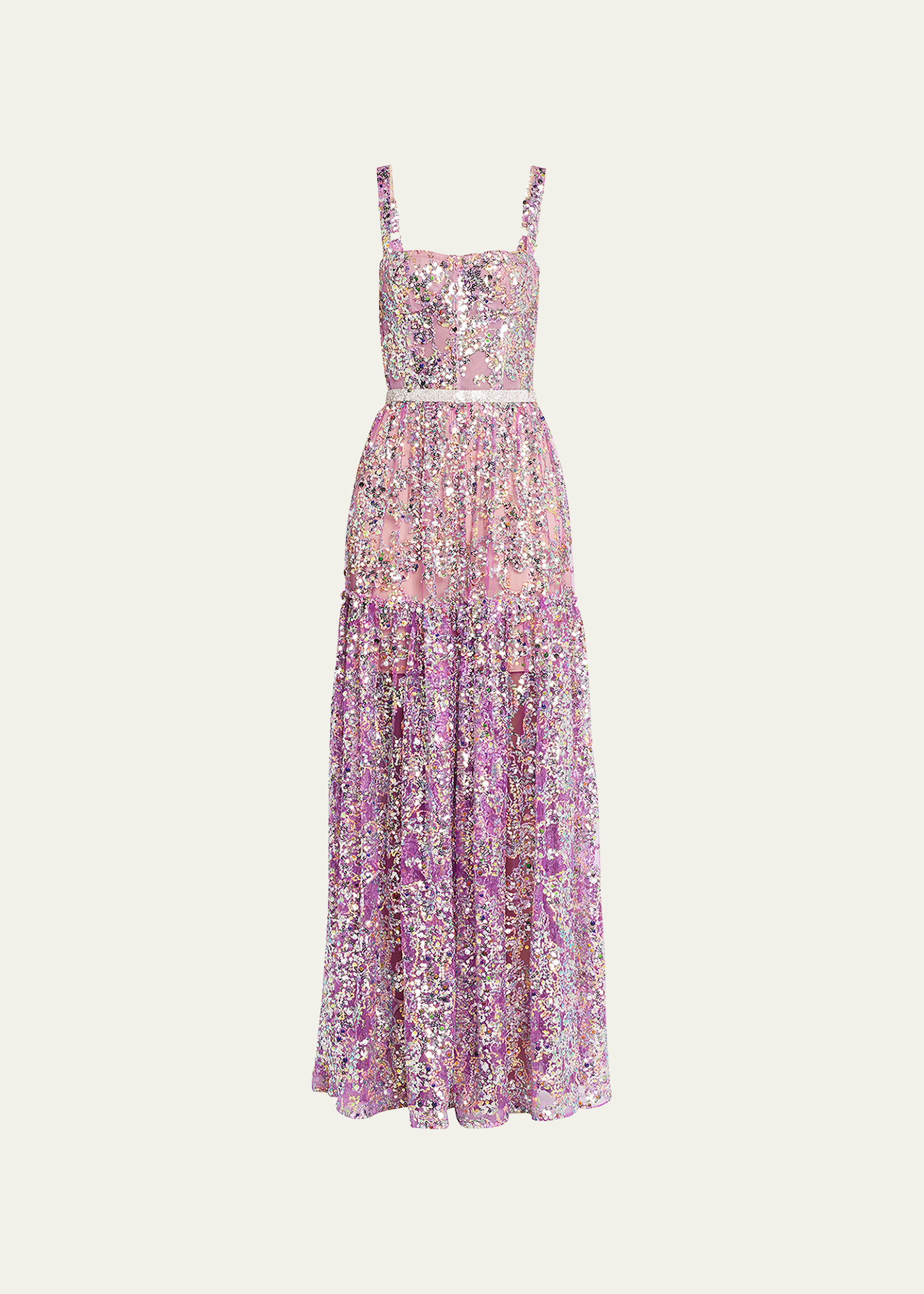 Bronx and Banco "Midnight" sequin gown with a corset bodice and rhinestone waistband Sweetheart neckline Underwire cups Sleeveless Full length Column silhouette Back zipper Polyester Lining: Polyester Hand wash or dry clean Imported