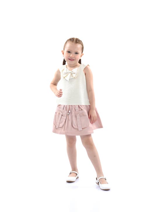 The Ivory Pink Strap Bow Shorts Set pairs playful charm with warm-weather ease. The ivory top features soft pink straps and a sweet bow accent, while the matching shorts offer a comfortable, breezy fit — perfect for sunny days and special outings alike. Lightweight and easy to wear, this set blends girly elegance with everyday comfort, making it a go-to favorite for stylish little moments. 100% Cotton Round Neckline Slip on Dry-Clean Imported